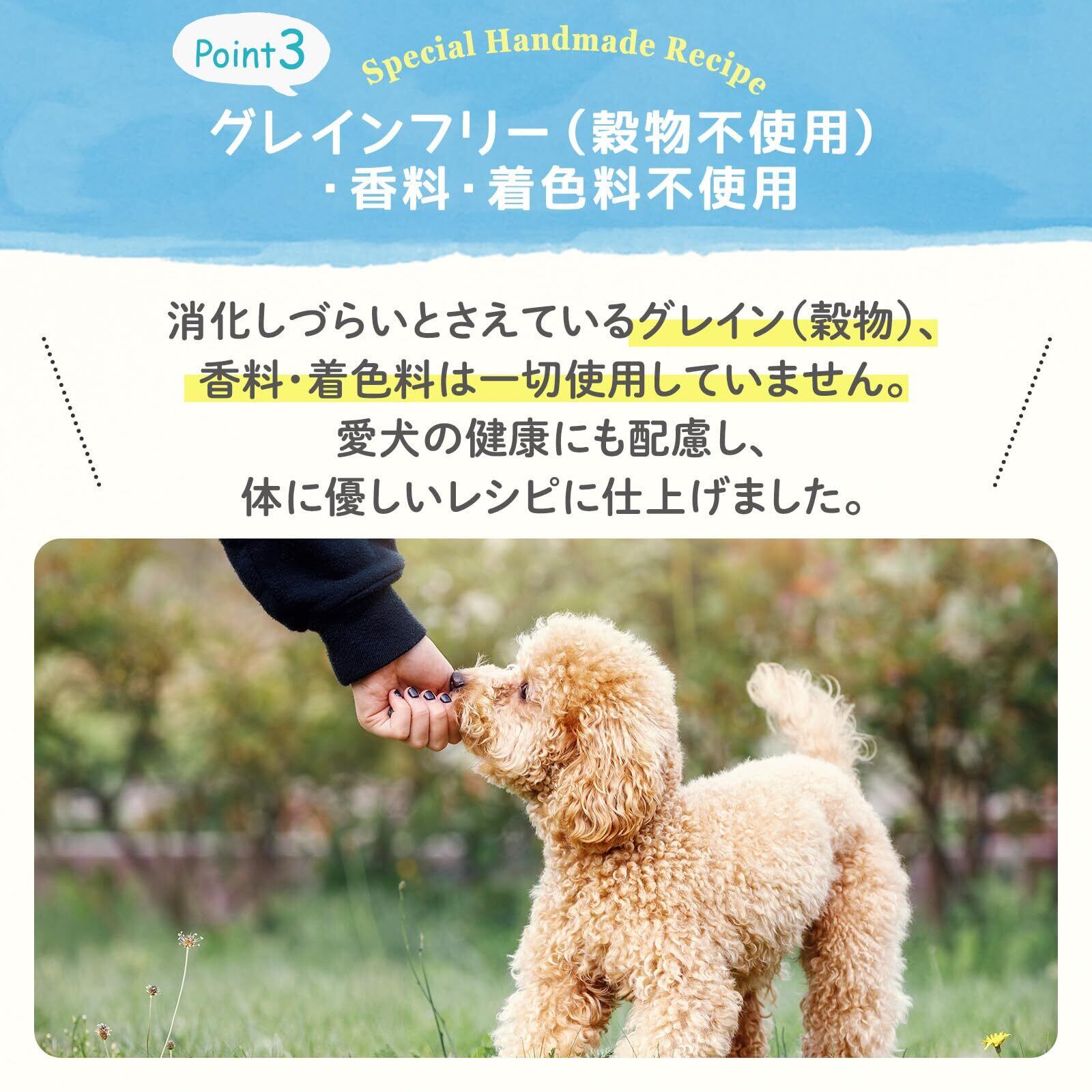 【ワンちゃんの体にやさしいグレインフリー】消化の負担にならないよう穀物は不使用。また、香料も不使用で体にやさしいフードに仕上げています。