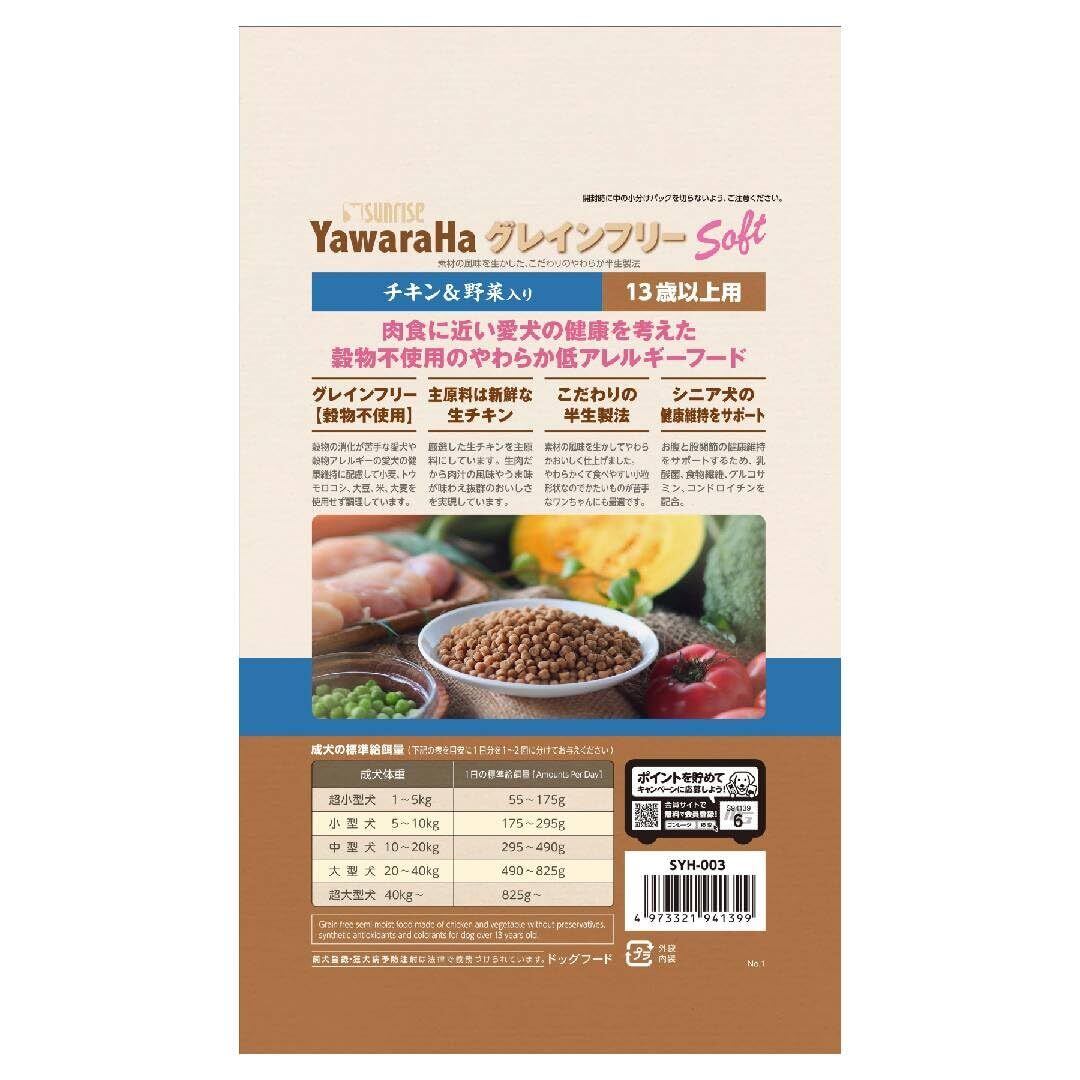 サンライズ ヤワラハ グレインフリー ドッグフード ソフトモイスト(半生) チキン&野菜入り 13歳以上 600g(100g×6袋) 国産 総合栄養食 シニア
