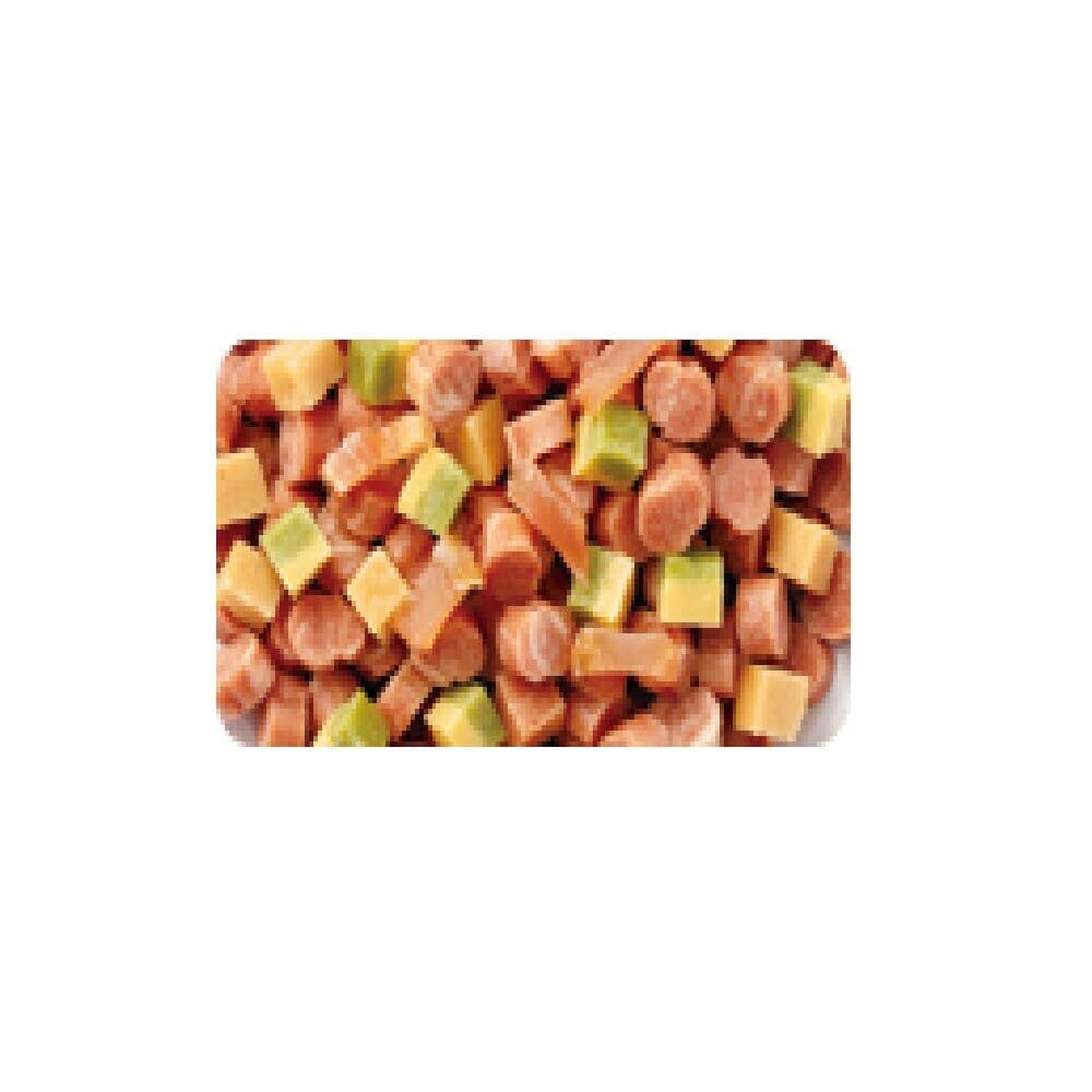 2種類の半生粒にやわらかなささみチップをトッピングした贅沢メニュー。究極のグルメを求める愛犬も納得!