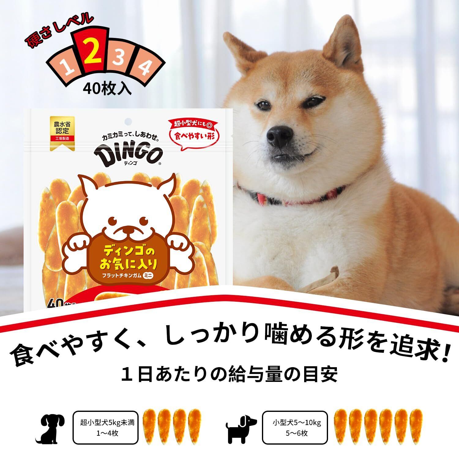 1日あたりの給与量の目安・・・超小型犬(5kg未満)1~4枚、小型犬(5~10kg)5~6枚。 永久歯の生えた生後10ヶ月以上の犬に与えてください。そばに新鮮な水を用意してください。丸呑みしてのどに詰まらせないよう注意しながらお与えください。与えすぎにご注意ください。