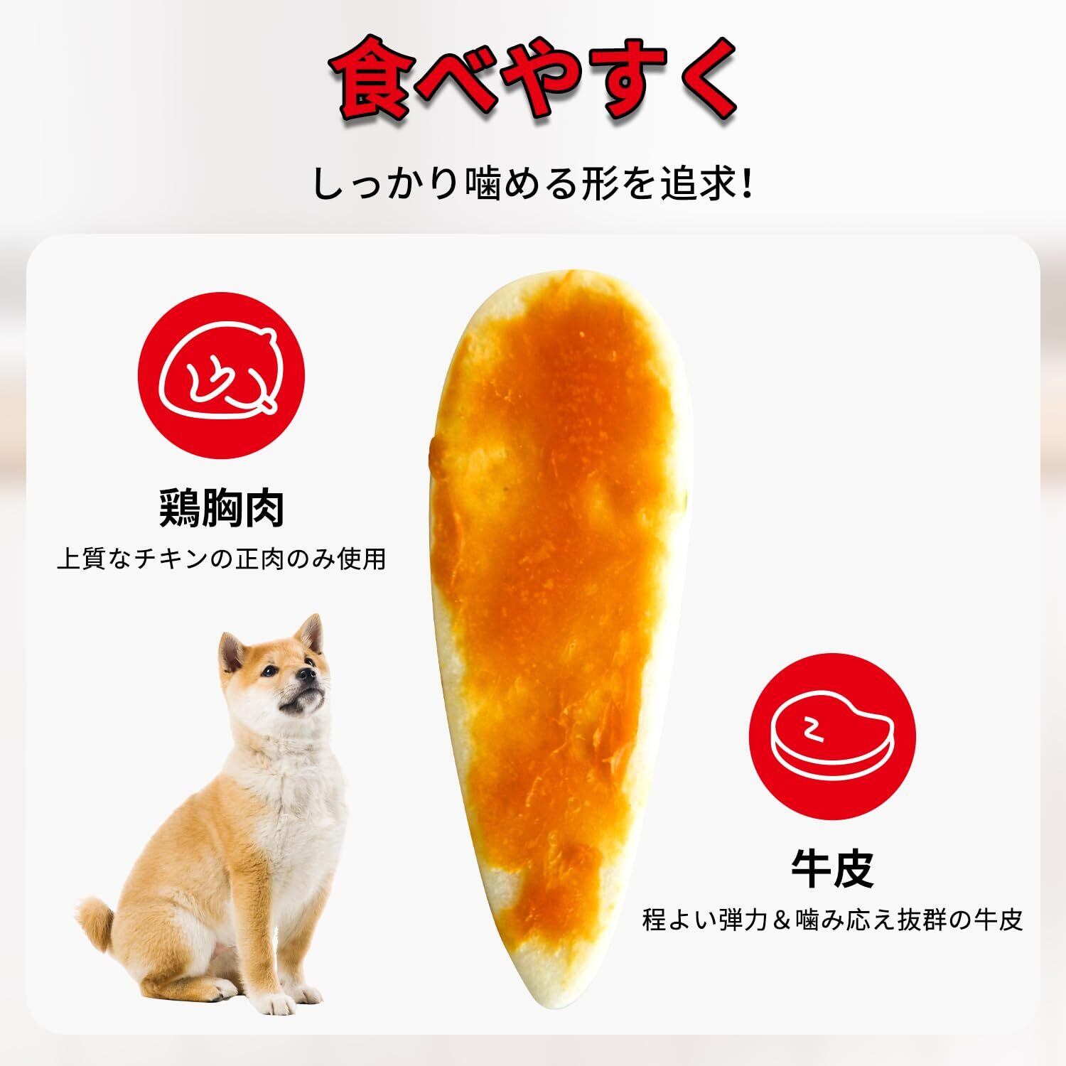 超小型~小型犬専用 食べやすく、しっかり噛める形を追求!上質なチキンの正肉のみ使用。 程よい弾力&噛み応え抜群の牛皮。 チキンの旨みが牛皮に染み込んで最後までおいしい。