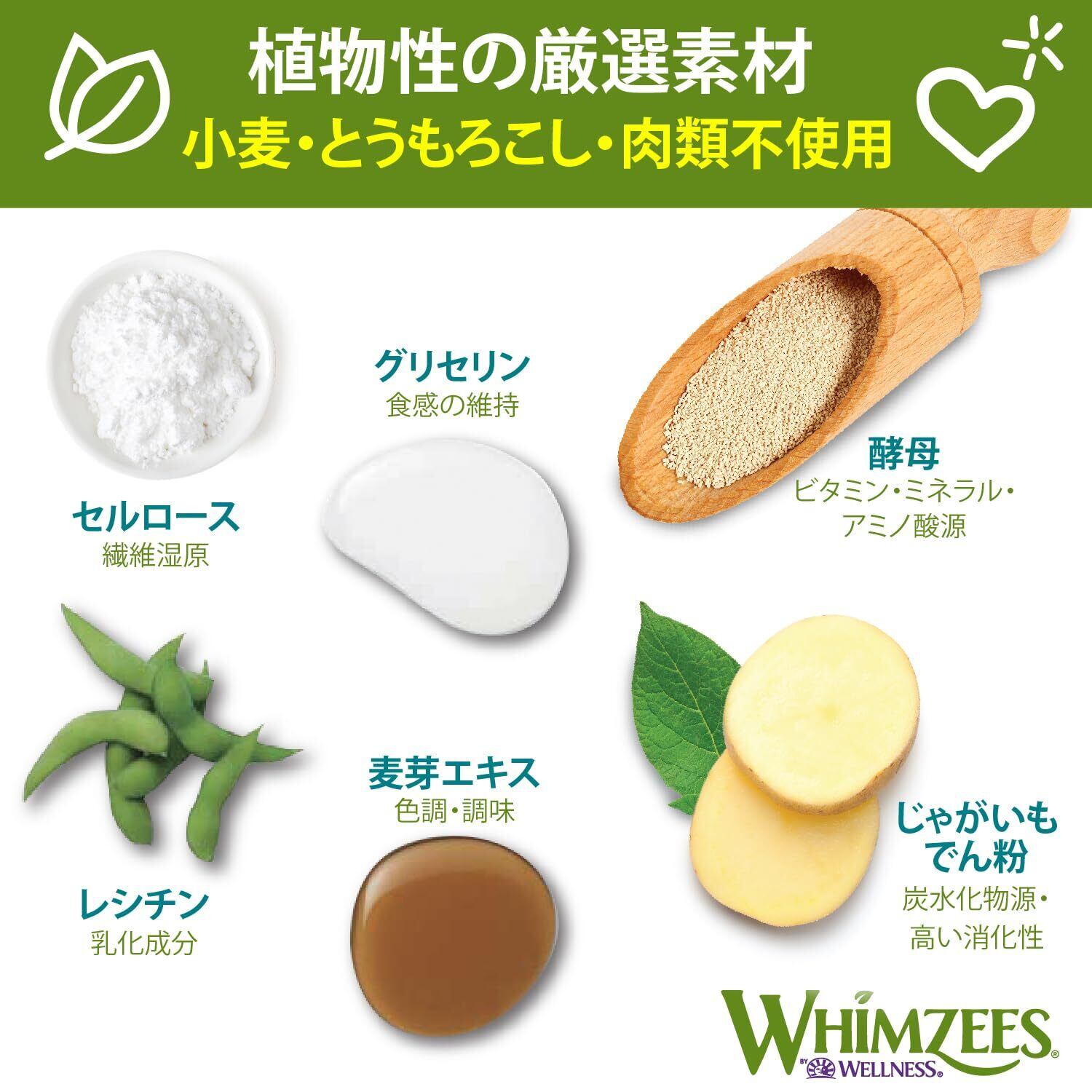 【厳選された植物性原材料】 じゃがいもでん粉などの植物性素材のみを使用し、小麦やとうもろこし不使用。