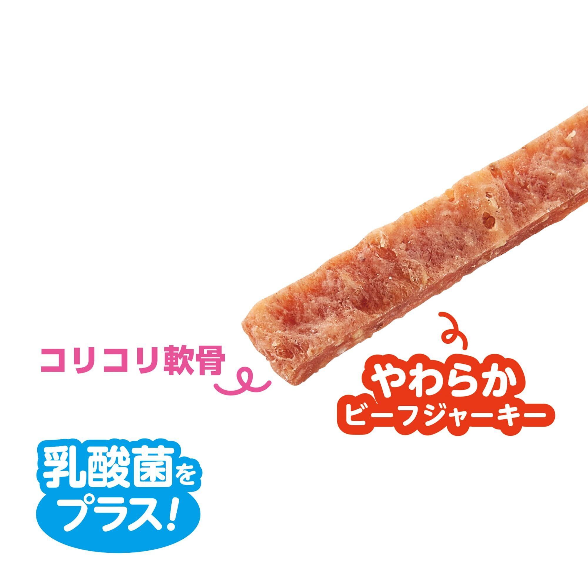 お肉をたっぷり使ったビーフジャーキーの美味しさと軟骨のコリコリとした食感がダブルで味わえる、嗜好性の高いスナックです。お腹の健康維持をサポートするために乳酸菌も配合されています。