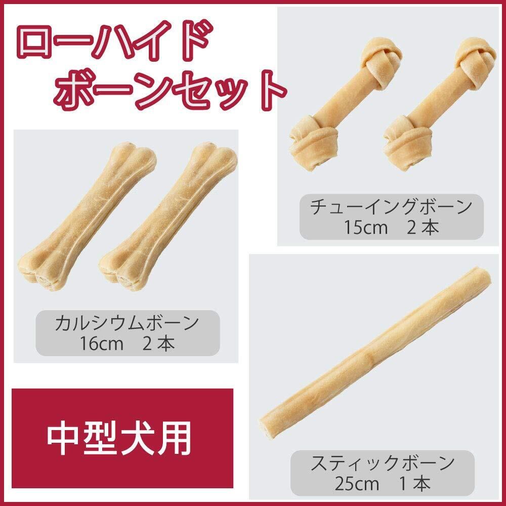 カルシウムボーン約16.5cm×2本/チューイングボーン約15cm×2本/スティックボーン約25cm×1本の計5個セットです。