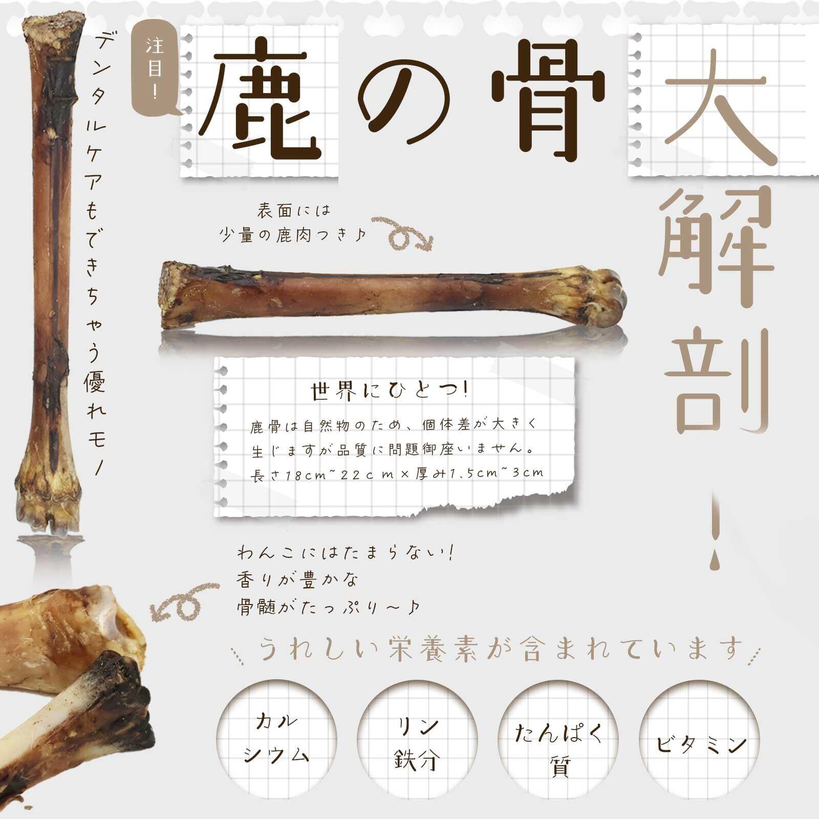 ●鹿の骨は歯や骨を強くするカルシウムやミネラルがたっぷり。※与えすぎは便秘の原因となりますので身体の大きさに合わせ、1日5分~20分程度を目安にお与えください。
