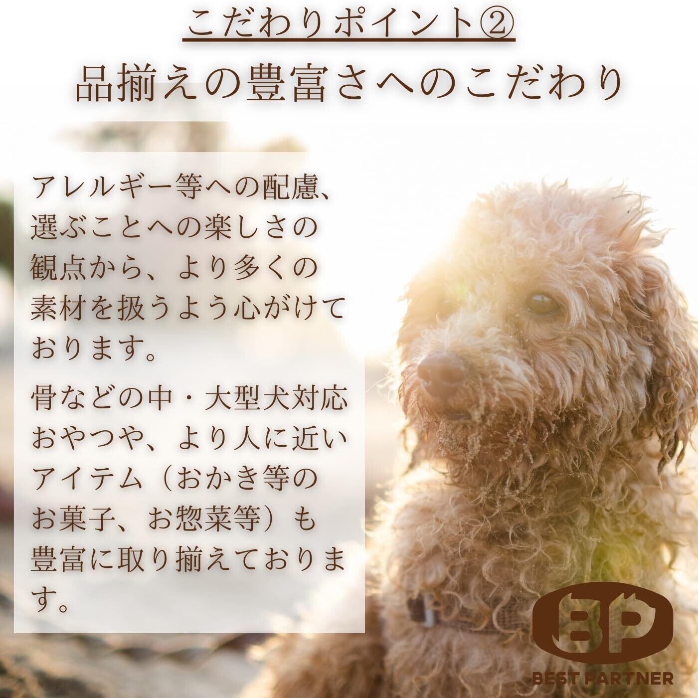 【国産・無添加・無着色のこだわり】『添加物は、あまり好ましいものでは無い』との考えから、可能な物はできる限り「無添加」に仕上げております。ベストパートナーのおやつは、一部を除き、『国産・無添加・無着色』にこだわっております。無添加で仕上げるということは、素材をじっくりと乾燥し水分を少なくすることを意味します。結果、素材そのものが比較的硬くなり、おいしさが凝縮されます。硬いものを噛むことで 歯・あごが鍛えられ、唾液の分泌も促されることから、自然な口内洗浄が期待できます。