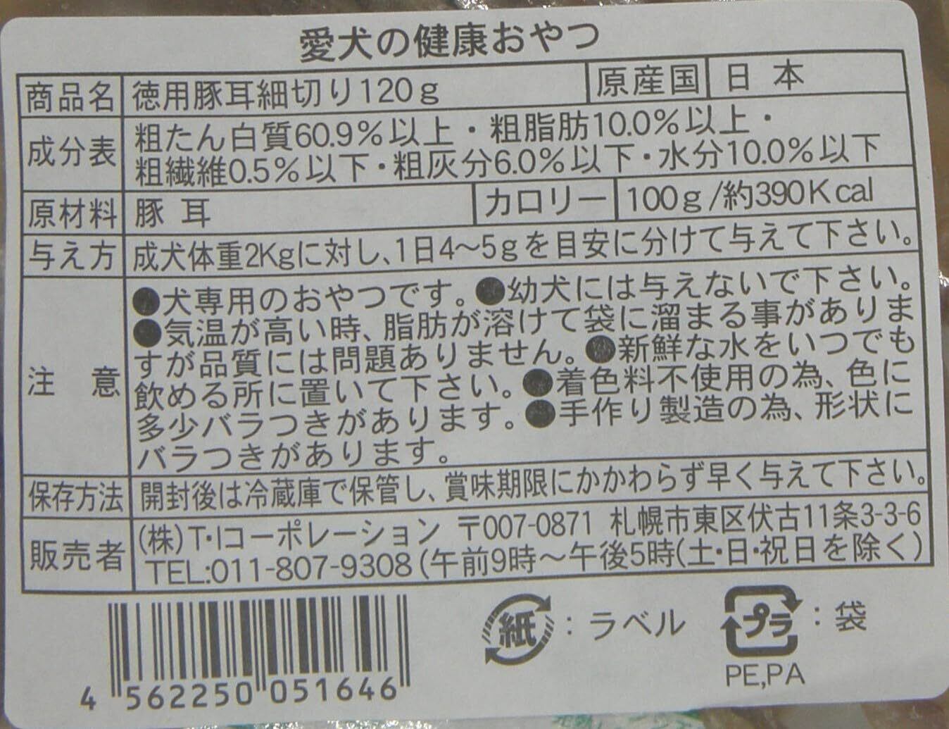 【北 海 道 直 送】 徳用豚耳細切り ペットフード 犬用おやつ 国内製造 無添加 無着色 コラーゲンたっぷり 愛犬のおやつ 豚耳 ペットフード 犬 1P (120g×1)