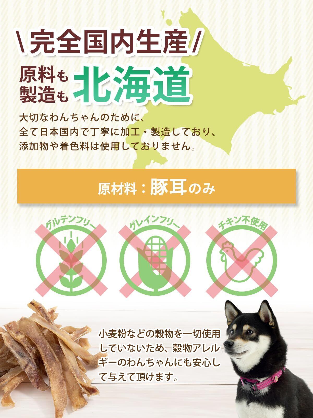 新鮮な北海道産の豚耳を使用し、無添加・無着色の安心安全な豚肉100%の愛犬のおやつです。