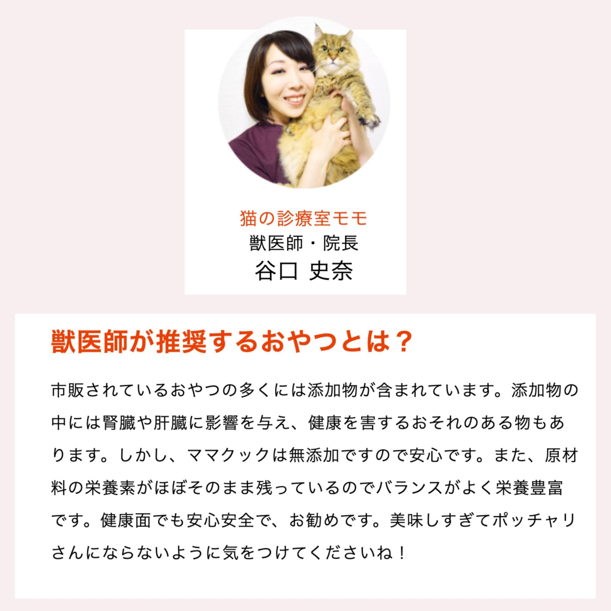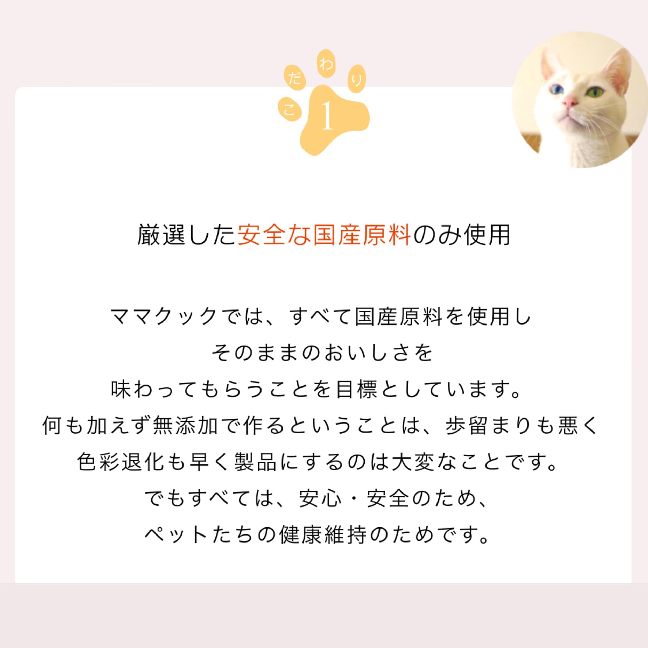 厳選した原材料を使用 ママクックでは、すべて国産原料を使用しそのままのおいしさを味わってもらうことを目標としています。 何も加えず無添加で作るということは、歩留まりも悪く色彩退化も早く製品にするのは大変なことです。 でもすべては、安心・安全のため、ペットたちの健康維持のためです。