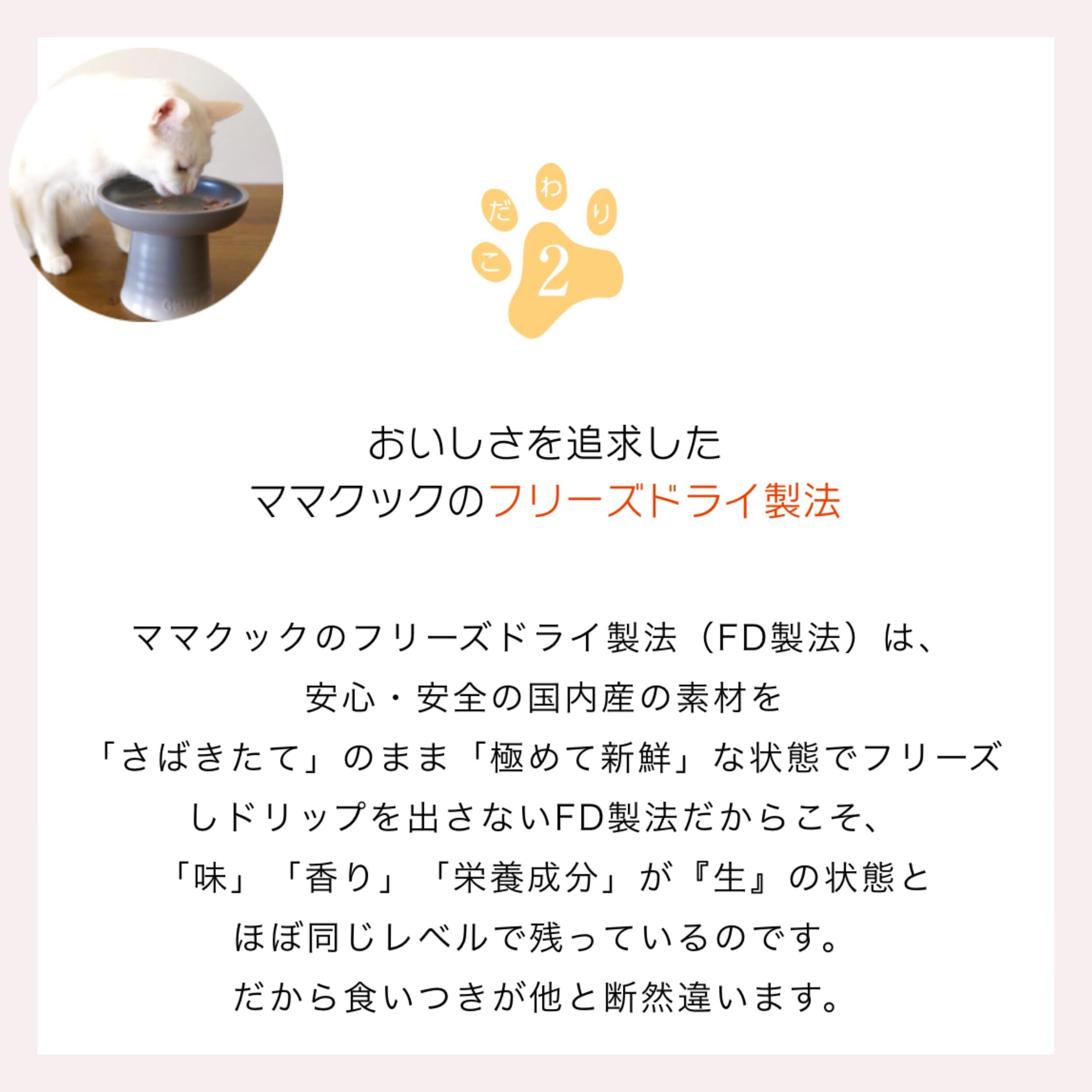 食いつき抜群の秘密:フリーズドライ製法 ママクックのフリーズドライ製法(FD製法)は、安心・安全の国内産の素材を「さばきたて」のまま「極めて新鮮」な状態でフリーズしドリップを出さないFD製法だからこそ、「味」「香り」「栄養成分」が『生』の状態とほぼ同じレベルで残っているのです。だから食いつきが他と断然違います。