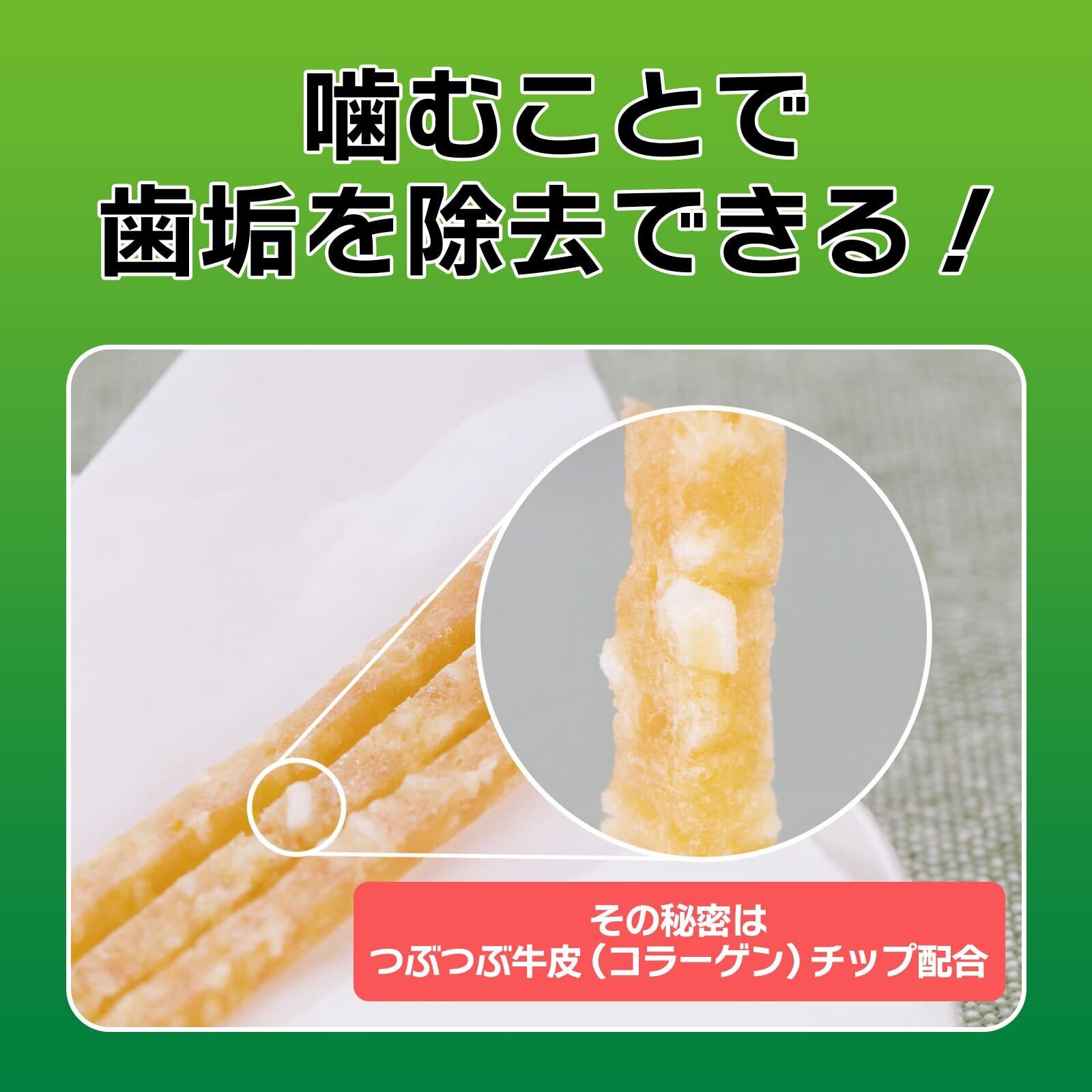 国産の鶏ササミジャーキーに野菜をプラス、つぶつぶ牛皮(コラーゲン)チップを配合。砂肝、鶏ガラスープを配合し、おいしさアップ。ちぎりやすいから、ちょこっとあげたい時にも。脂質50%オフ※。 ※「PETKISSワンちゃんの歯みがきおやつ ササミスティック 野菜入り」比(100g当たり)