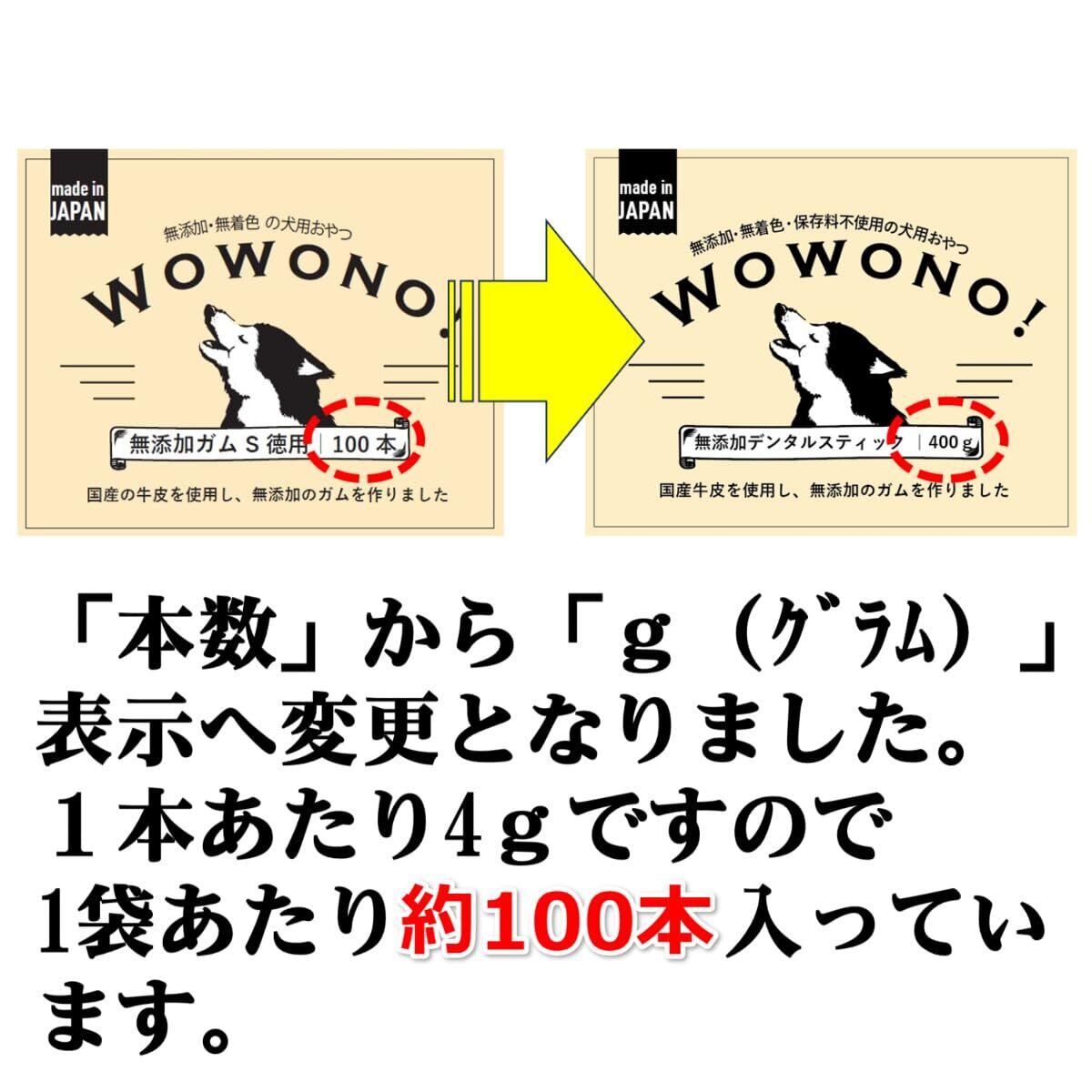 Wowono!(ワオーノ!)の犬用おやつシリーズ 国産の牛皮を使用し、ガムを作りました。 大容量の400g(約100本)入り!食べながらハミガキ! 無添加・無着色