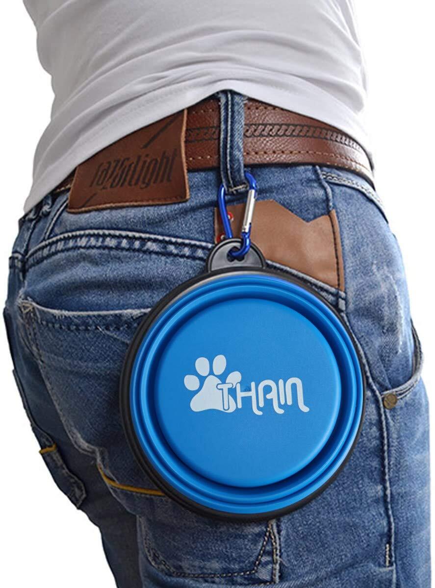 THAIN 犬 水飲み 携帯用 散歩用 折りたたみ式 ペット給水器 容量350ML シリコン製 コンパクト 水やり用品 持ち運び便利 ペットボウル カラビナ 付き 給水器 給餌器 旅行用 (ブルー)