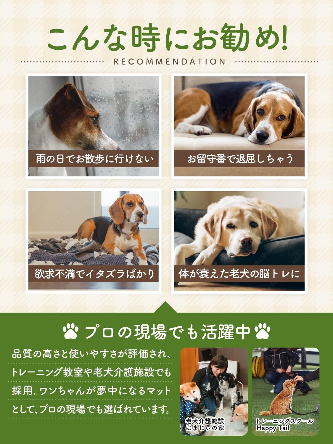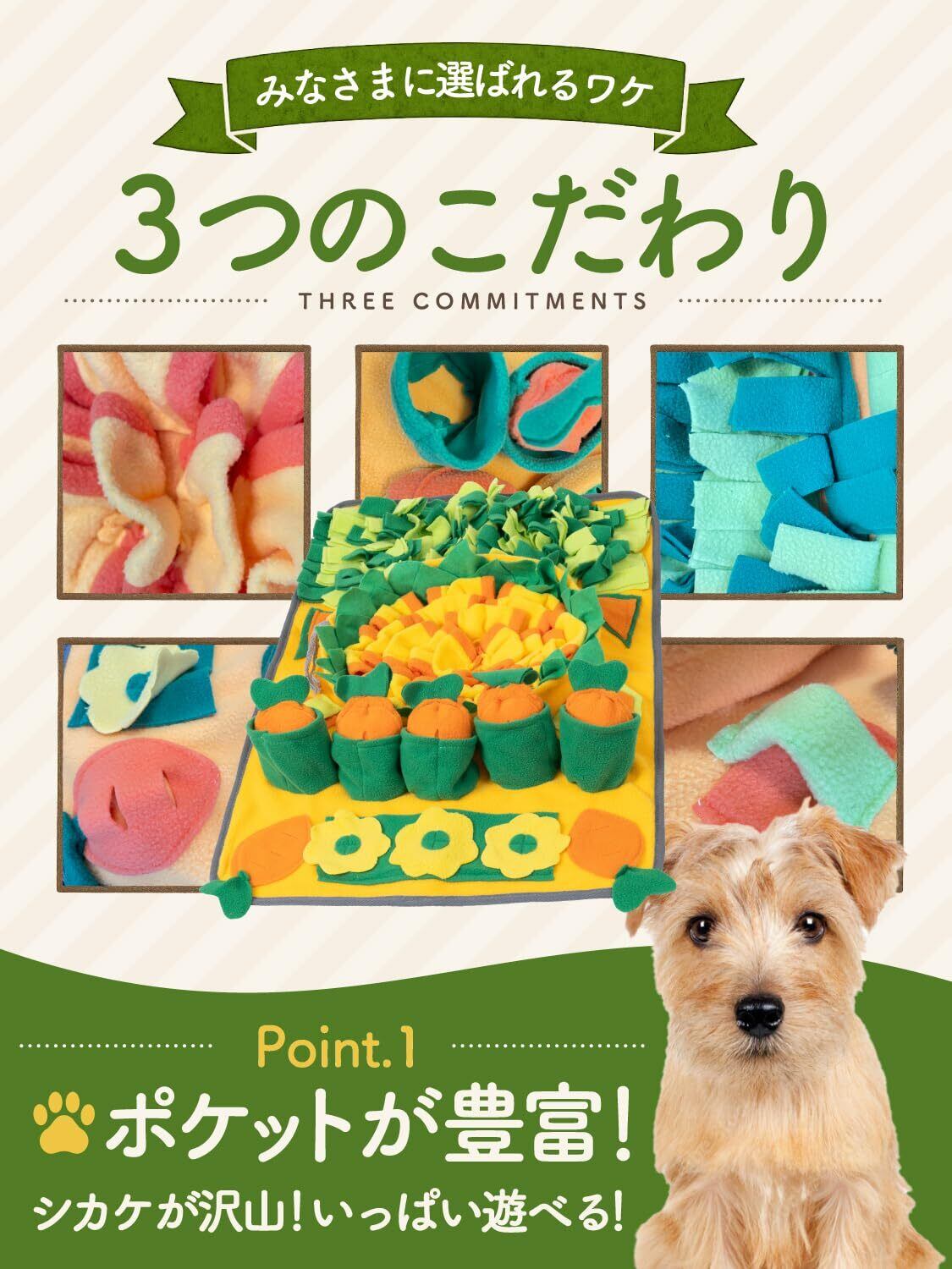【ノーズワークマットとは】ワンちゃんの臭いを嗅ぐという生まれ持った本能を満たしながら楽しめるトレーニング用品です。ワンちゃんは嗅覚を使い様々な仕掛けに隠されたおやつを見つけていくことで、達成感を感じ夢中になって楽しみながら自信を育んでいくことができます。ノーズワークマットを利用することで、ワンちゃんの頭や心を満たし、心身のエクササイズ、意欲の向上などメリットがたくさんあります。