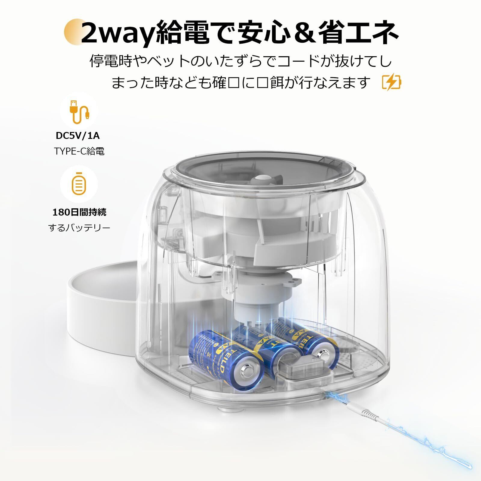 【二重電源で停電も安心】電源アダプター給電に加え、単1形乾電池(別売)の併用を推奨。停電時は電池に自動切り替わり、給餌設定がリセットされる心配がありません。