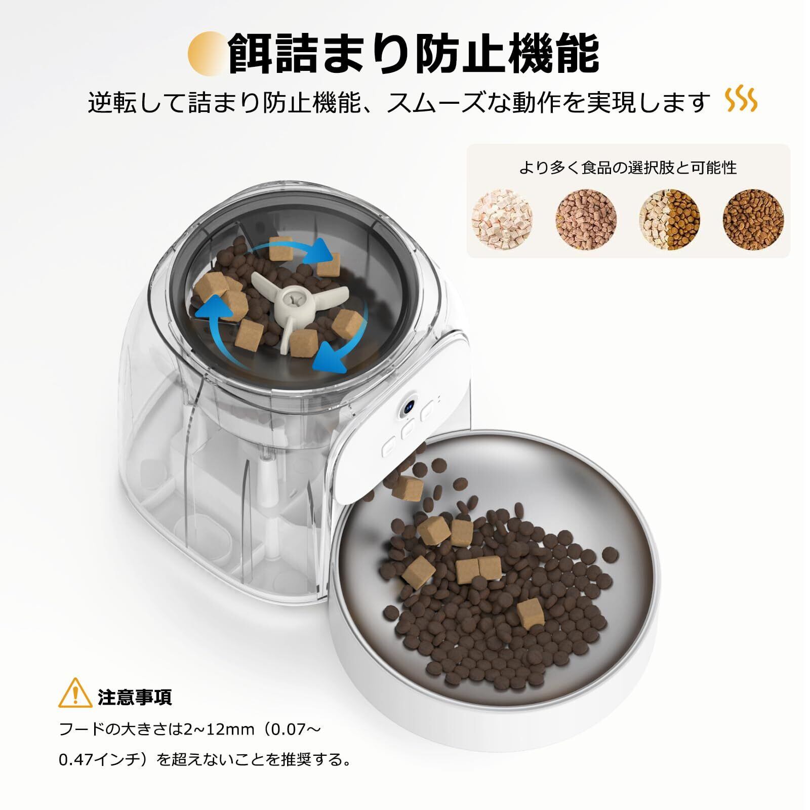 【自動給餌で手間いらず】1日1~15回、1回あたり1~20杯まで調整可能な自動給餌機能。手動給餌も対応し、アプリで簡単に餌の量と時間を設定できます。設定した時間に自動で餌が出るので、餌やりが楽々。給餌記録はアプリで確認でき、フードが不足すると通知が来るので、忙しくてもペットの食事管理はバッチリ。ペットの規則正しい食事習慣をサポートします。(※2.4GHz帯Wi-Fiのみ対応)