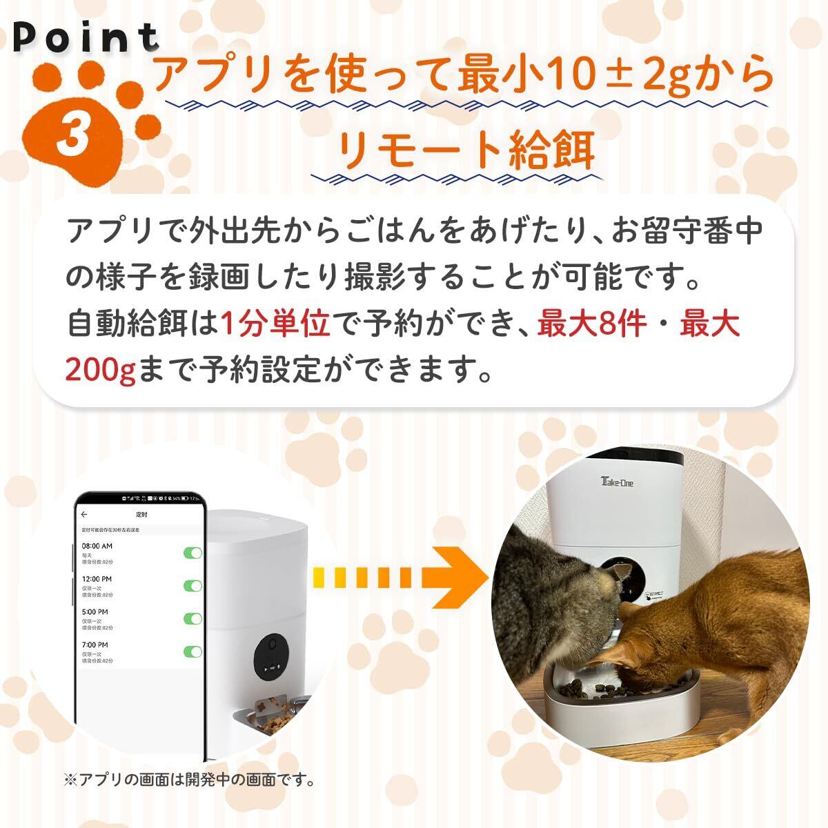 【Wi-Fi接続/アプリコントロール】 ●自動給餌の予約時間設定は、Take-One Homeアプリから簡単に操作できます。 外出先から遠隔操作でペットに餌をあげられるので、急な残業やお友達との予定が入っても安心です。手動操作で給餌することも可能です。