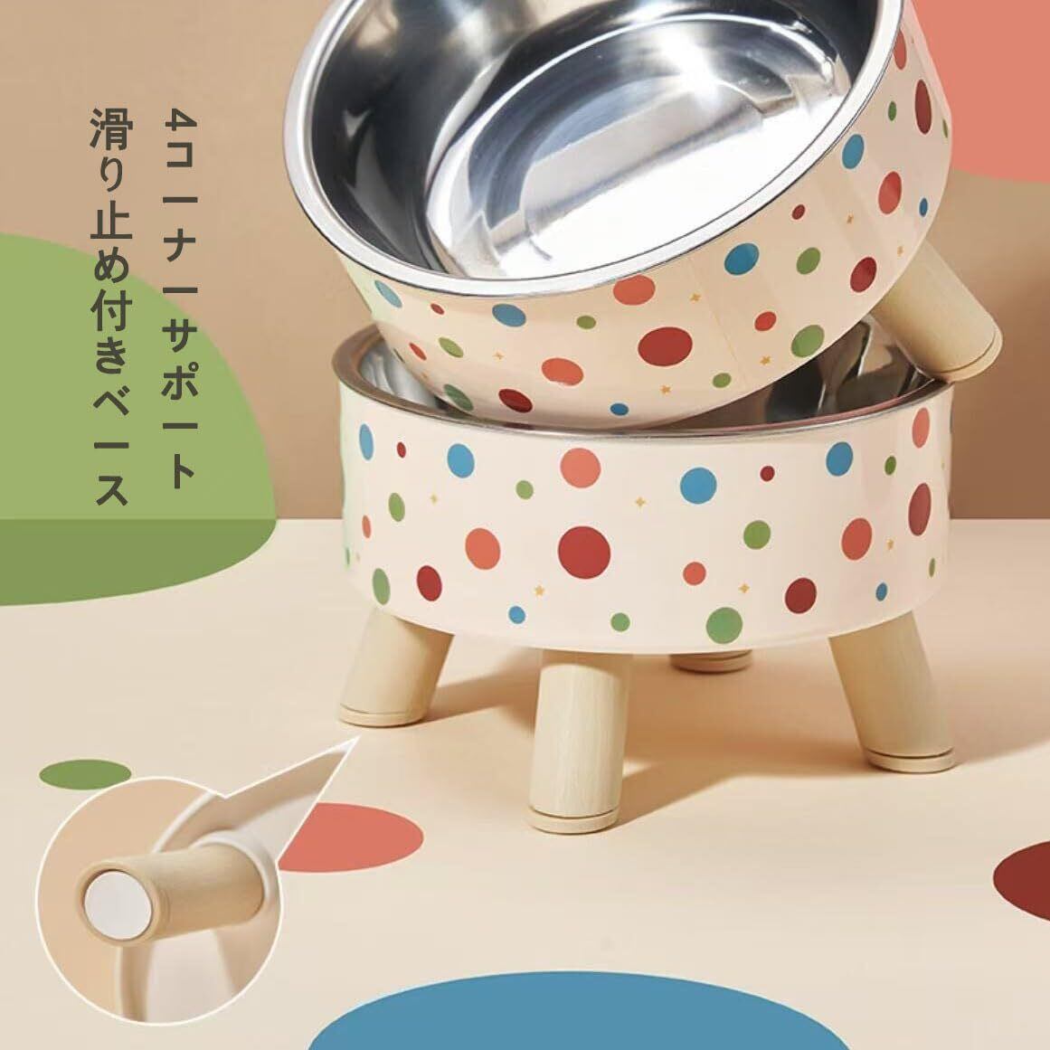 ペットボウル台 カラフルなドット 犬猫食器フードボウルスタンド プラスチック 取り外し可能ステンレス 猫食器 ペット皿 安定感 手入れ簡単 ペット用品