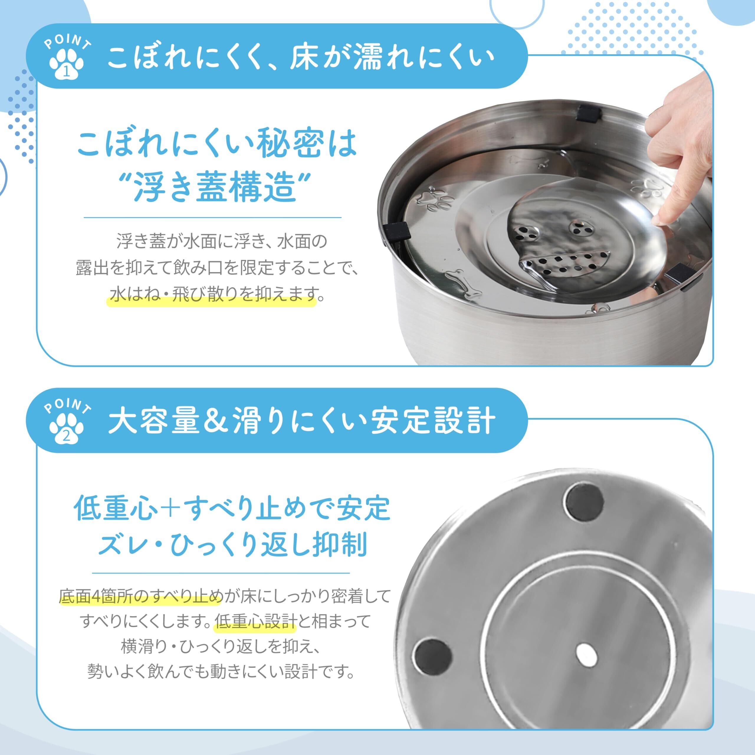 【こぼれにくく、床が濡れにくい】 こぼれにくい秘密は“浮き蓋構造”にございます。 フタが水面に浮かび、水の表面をやさしく覆うことで、ペットが必要な分だけ飲める設計となっております。 これにより水が飛び散りにくく、床や周囲が濡れにくいため、日々のお掃除も簡単で清潔に保つことができます。