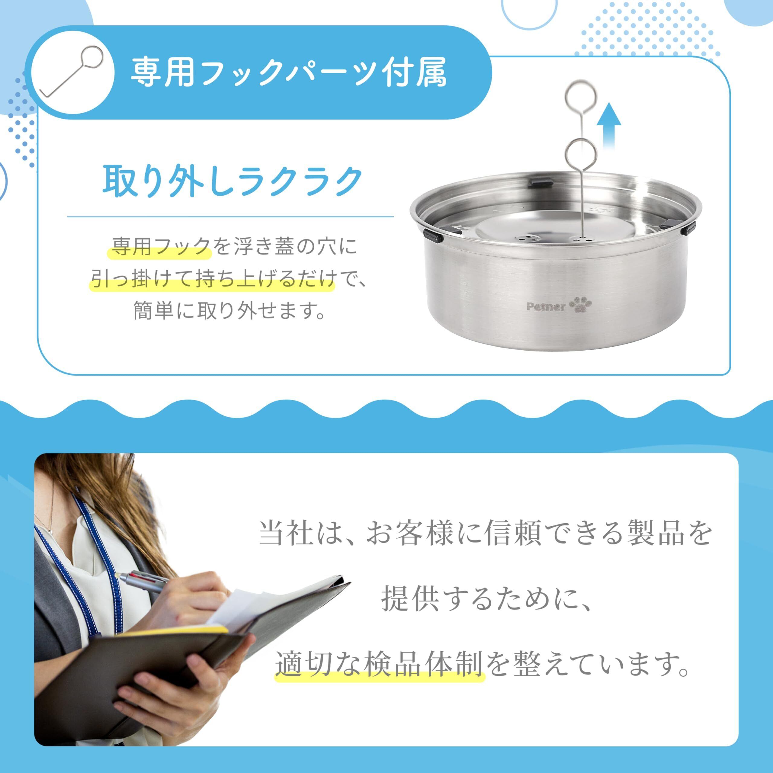【清潔を保ちやすいステンレス製】 本体およびフロート部分にはステンレスを採用しており、ぬめりやニオイがつきにくく清潔にお使いいただけます。 分解可能な構造のためお手入れがしやすく、乾きも早いため雑菌が繁殖しにくい設計です。さらに浮きフタ付きで、ホコリや毛が入りにくく、衛生的にご使用いただけます。