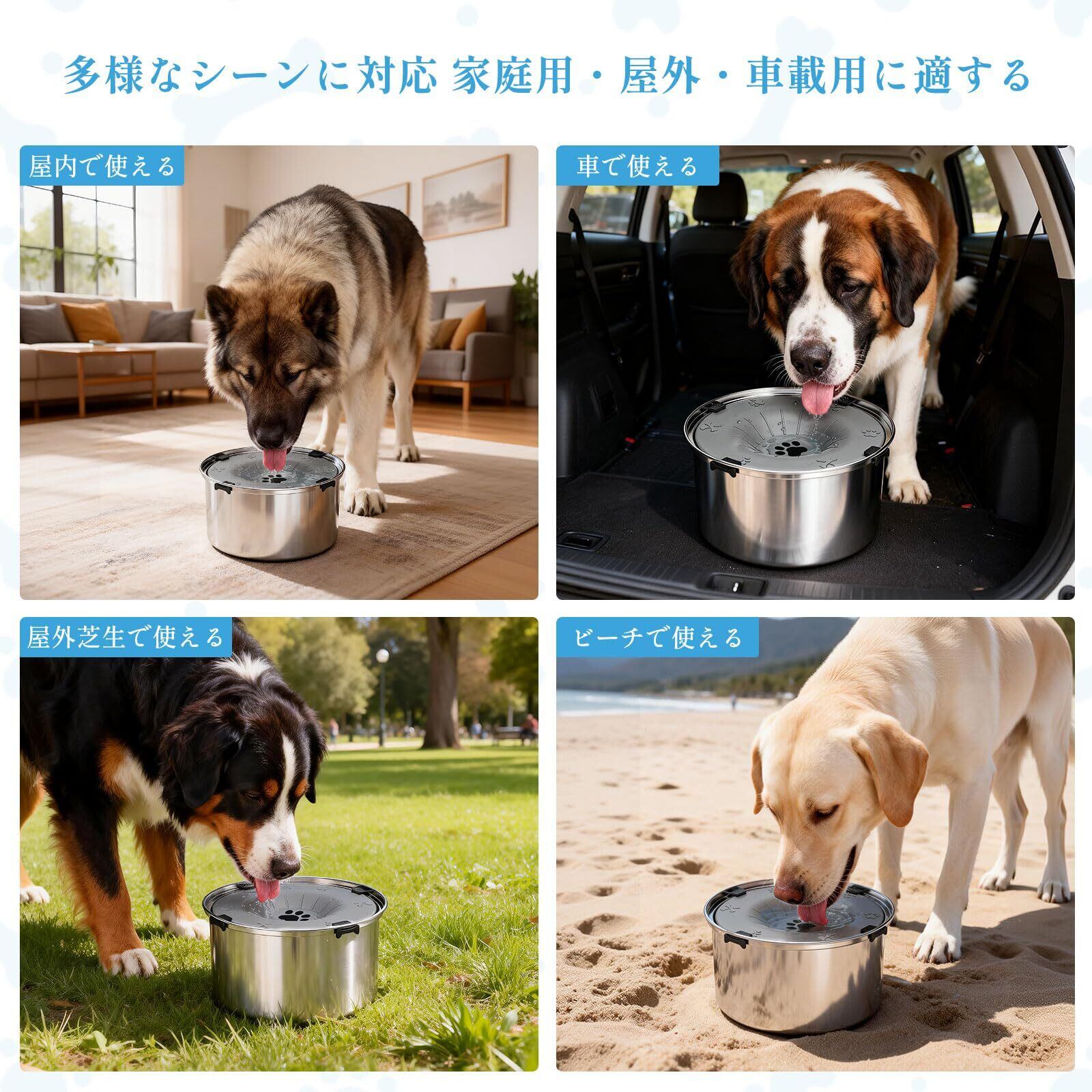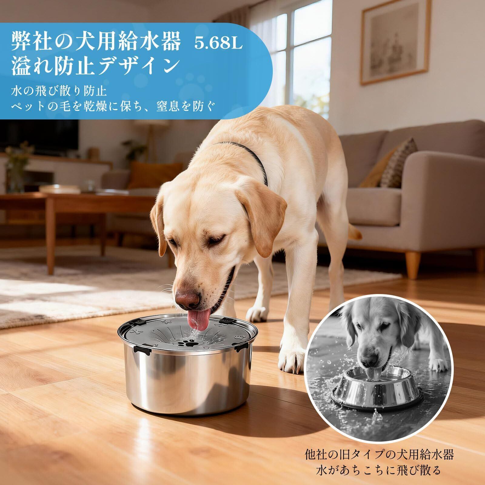 【中大型犬・多頭飼いに最適|人気犬種対応】 この水飲み器は約5.68L 大容量で、ゴールデンレトリーバー、ラブラドールレトリーバー、秋田犬といった大型犬や、柴犬、ボーダーコリー、ビーグルなどの中型犬に最適です。家庭で複数のペットを飼育している場合でも、充足した給水を可能にします。犬用 給水器 としてだけでなく猫 給水器 としても共用でき、ペット用品 の省スペース化にも貢献します。