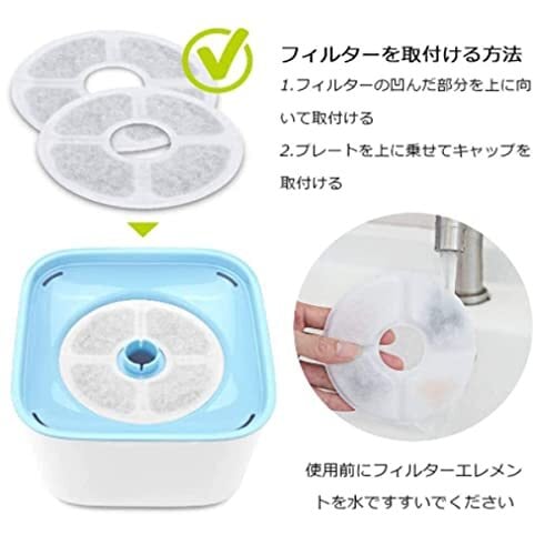 サイズ: 外径: 12.8cm; 内径: 3.9cm; 厚さ: 1cm。1.6L/2L/2.4L殆どの犬猫自動給水器に適用しております。購入する前にサイズをご確認ください。 取り付け簡単:使用前にフィルターを水で洗い流してください。フィルターの不織布側を上に向けて、フィルターの凸面側を対応するスロットに合わせて、給水器にセットして完了です。 【パッケージ】12倍の軟水化フィルター(1つのパッケージで約12) ご注意: 購入する前に、フィルターのサイズが給水器に適しているかどうかを確認してください。 水の鮮度を保つため、2~3週間ごとにフィルターを交換することをお勧めします。 フィルター交換時には、清潔を保つために必ず給水器本体各部を洗浄してください。 自動給水器が複数のペットに使用されている場合は、軟水化フィルターをより頻繁に交換することをお勧めします。 フィルターのお手入れの際には、洗剤を使用しないで、水で表面の汚れを洗い流してください。 夏場は毎日水の交換、フィルターの洗浄を行ってください。 なぜこの自動給水器軟水化フィルターを選ぶのですか? 三重濾過層:この軟水化フィルターは綿層、活性炭やイオン交換樹脂で構成されています。水中の汚物を除去し、浄化機能がアップします。フィルター層が2つしかない他のフィルターよりも健康的です。三重濾過層で毛皮や残留物を濾過し、臭いを吸収し、水を柔らかくすることができます。 より良い浄化性能:この軟水化フィルターはより多くの活性炭が含まれているため、より優れた浄化性能を実現できます。菌の?殖を抑えて、カルキ臭も吸着できます。 ペットを健康に保つ:水道水を軟水化し、皮毛、食べ残し、ほこりを取り除きながら循環しています。水を常に新鮮な状態に保つ仕組みがあります。