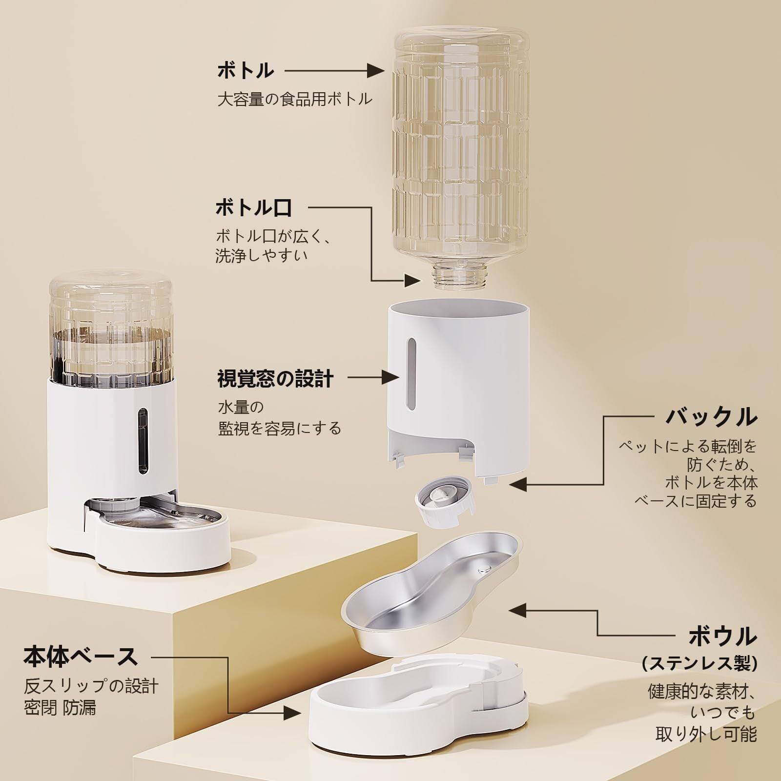 【底面を拡大し、より安定した構造】猫用ディスペンサーの底面は拡大され、4つの滑り止めの足が付き、ペットが飲む時に滑りにくく、より安定します。そして、ディスペンサーはバケツカバーのデザインで、よりシンプルで寛大な外観です。