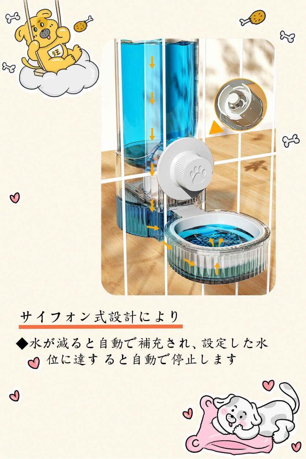【優れた設計】電源不要、重力の原理を利用して、ケージに簡単に吊るすことができます。サイフォン原理、水漏れもなく、スムーズに水も出るし、新鮮な水を確保できる。スムーズに給水できる構造で、水漏れも心配不要。初心者の方にも扱いやすい設計です。