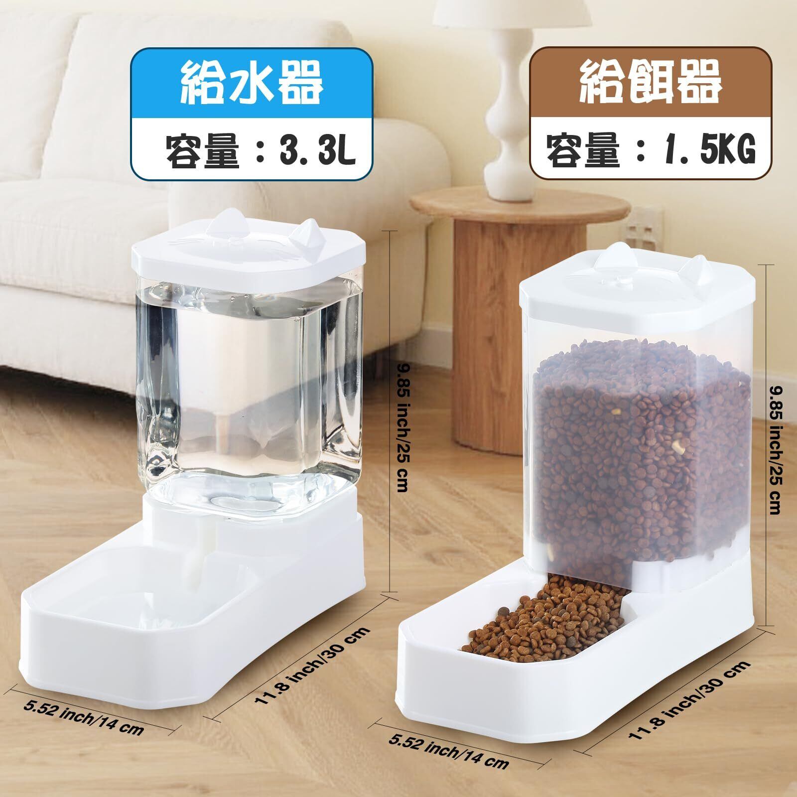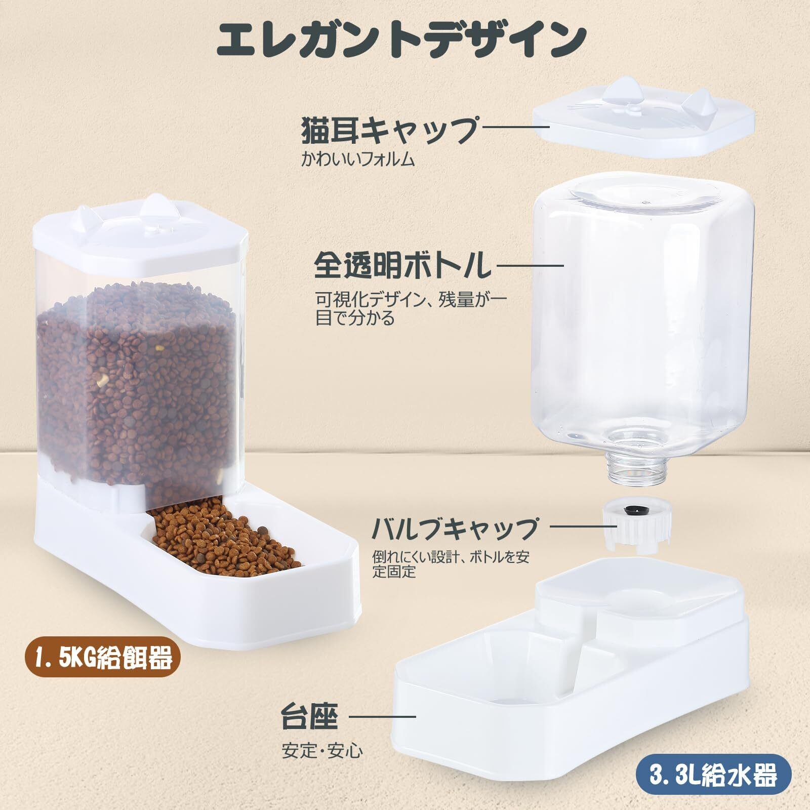 1.5kg+3.3Lの大容量設計: フードタンク約1.5kg、ウォーターボトル約3.3L。多頭飼いのご家庭や長時間のお留守番にも対応し、こまめな補充が不要