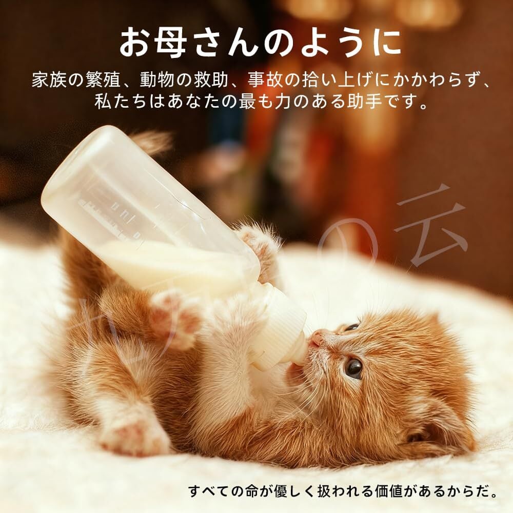 それぞれの成長段階に合わせた設計:柔らかいシリコン製乳首4個(長2個、短2個)と、異なるサイズのシリンジ4本(1ml、3ml、5ml、10ml)が付属。生まれたばかりのペットの年齢やニーズに合わせてミルクを与えることができます。