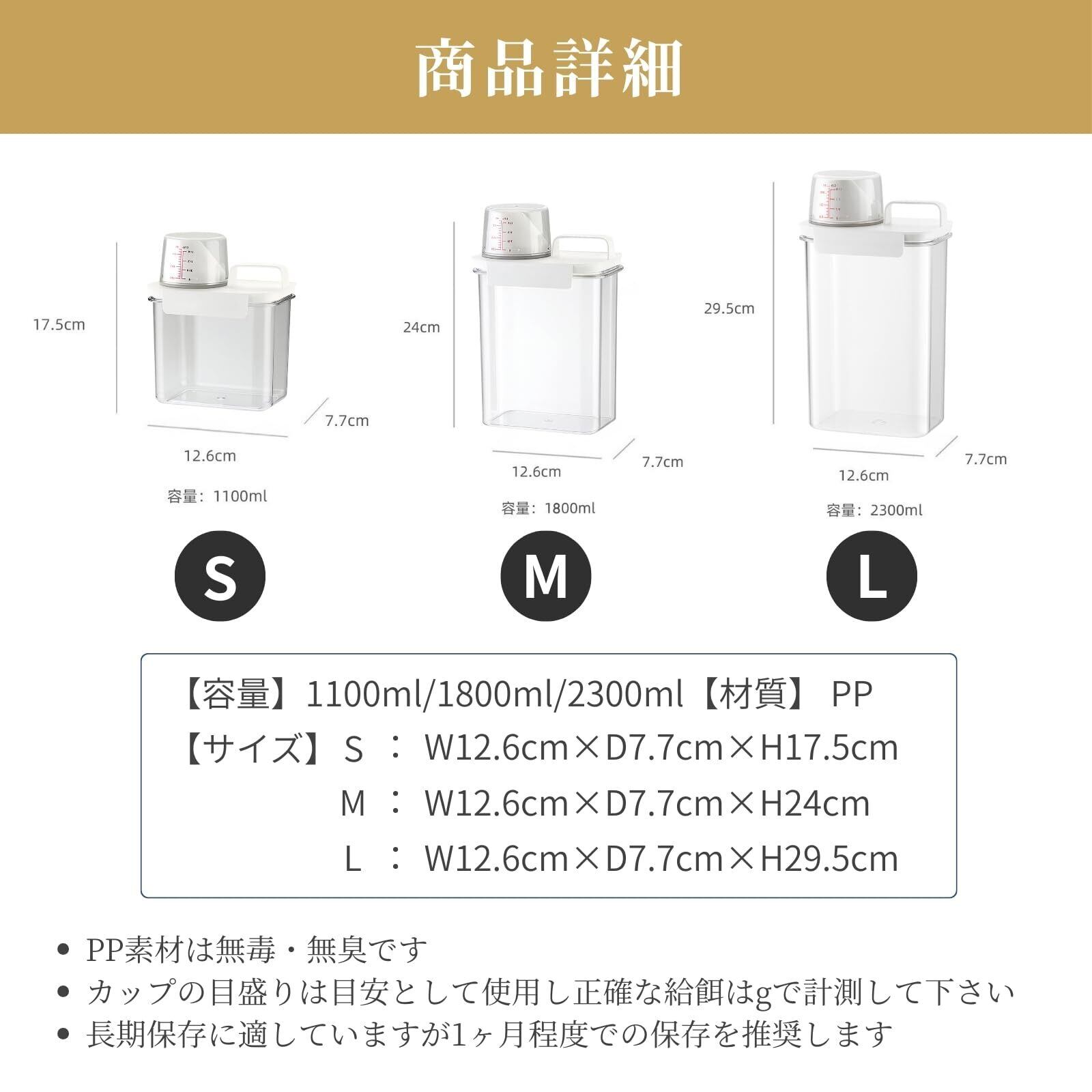 【選べる3サイズ】 S(1100 ml)、M(1800 ml)、L(2300 ml)のラインナップで、愛犬の食べる量やキッチン収納に合わせて最適サイズが選べ、無駄なストックを防ぎます。