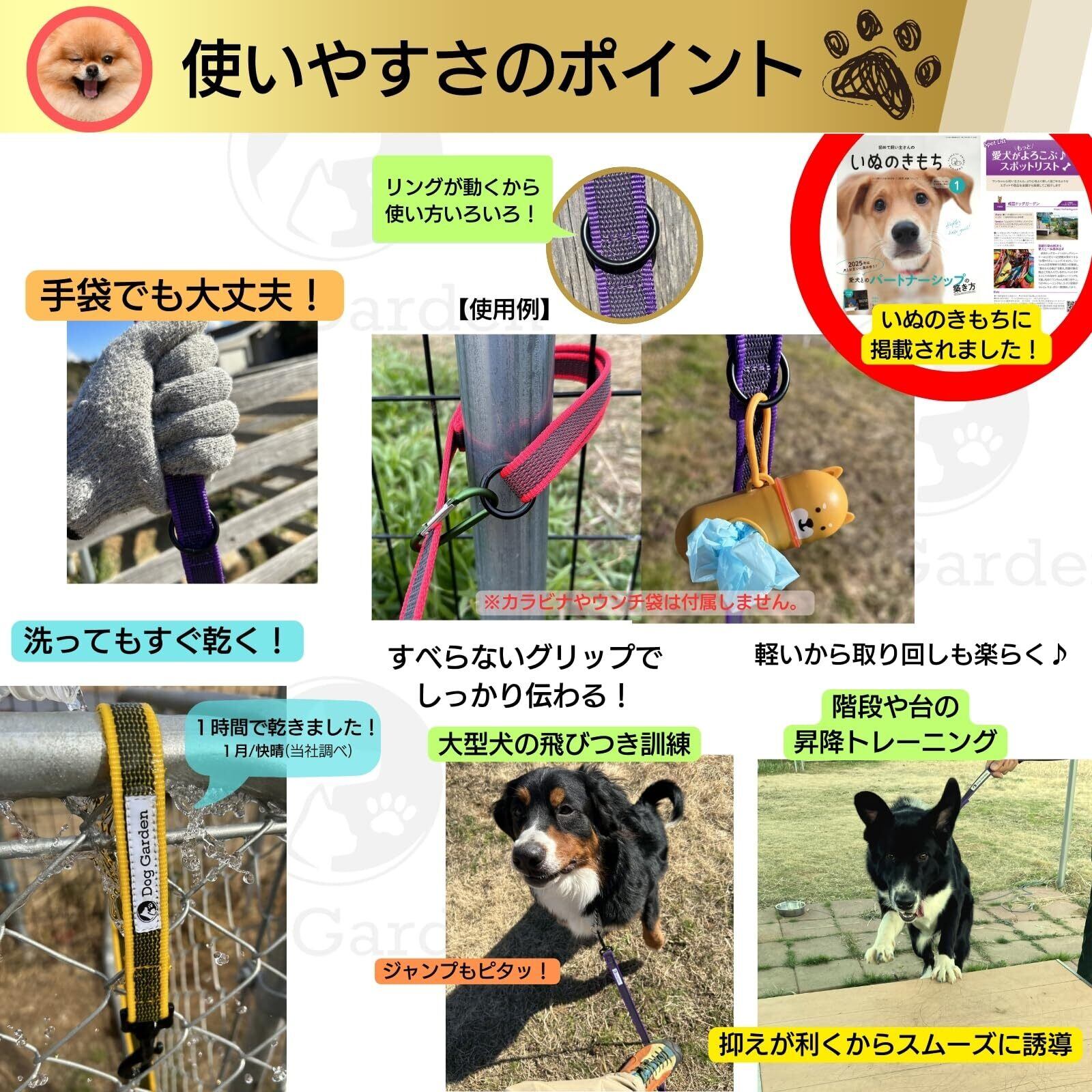 ナイロン素材にゴムを編み込んでいます。手袋や雨の日でも滑りにくい。伸びないから犬を制止しやすい。