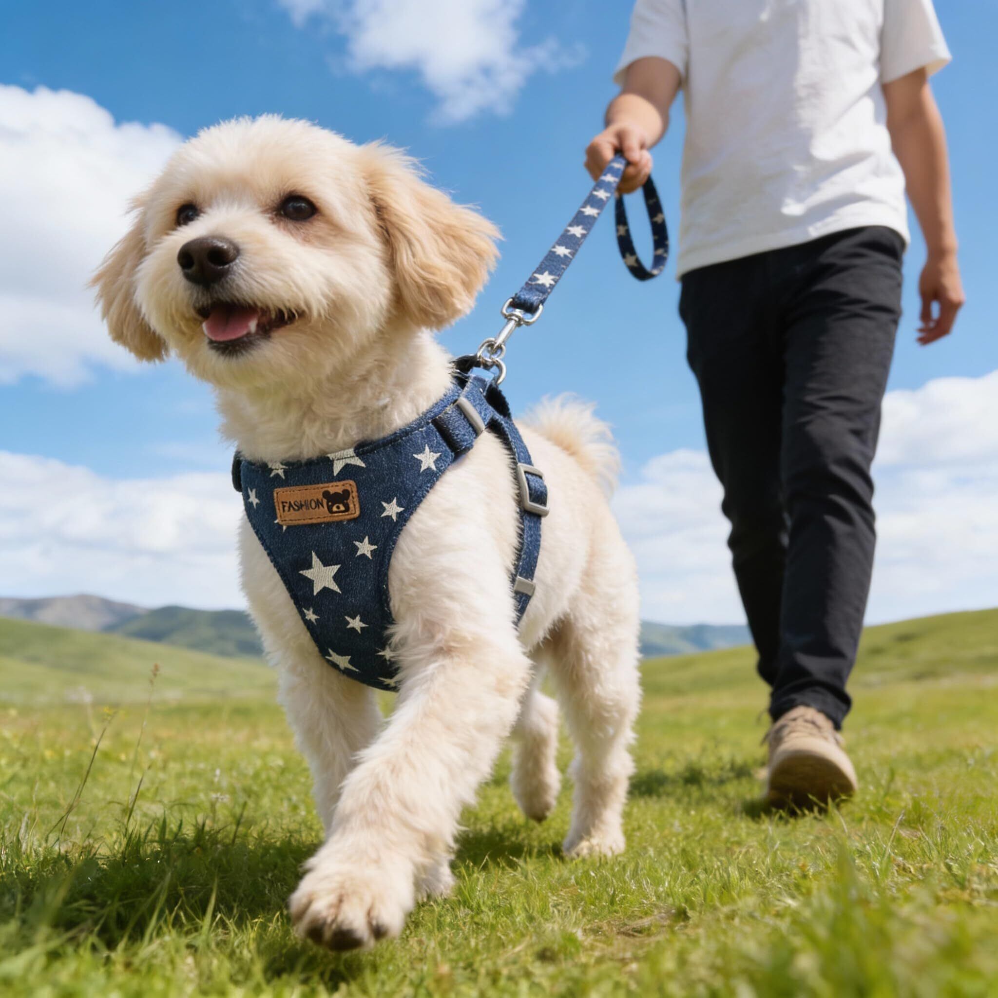 【数量限定】JoyFusion 犬 ハーネス 3ウェイ 軽量 調整可能 布製 2メートル長 通気性 メッシュ 星柄 おしゃれ 子犬 小型犬 中型犬 散歩用 抜けない ハーネス 猫 ブルー星星 L (4-8KG)