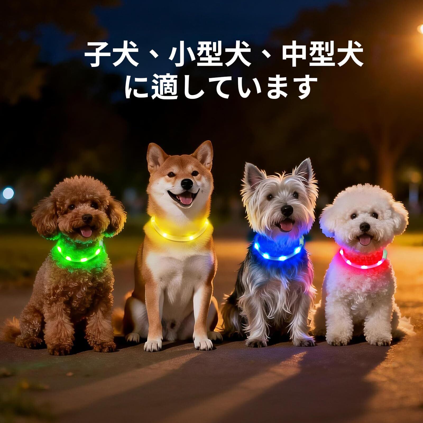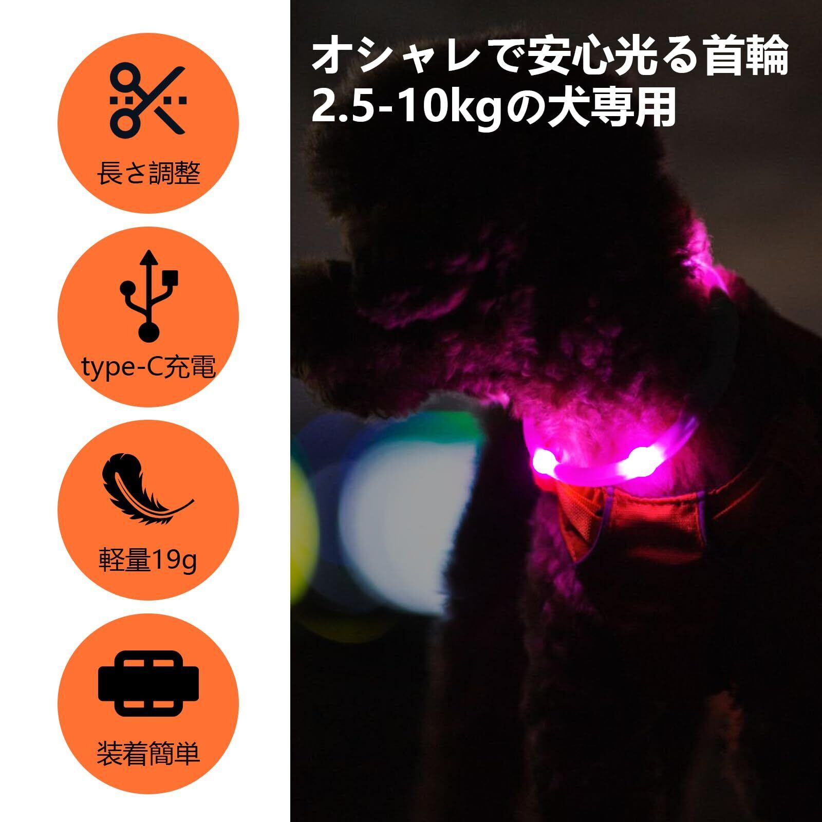 充電式設計: ワンタッチで点灯できる使いやすいLEDユニットを搭載し、充電時間は30分、5〜7時間の連続駆動が可能です,視認性抜群 400メートル以上の視界を提供し、夜間の車、自転車などから愛犬を守ることができます。かなり目立ちますので、ペットの位置が示され、夜の散歩などに最適です。軽量19gで愛犬の負担を軽減