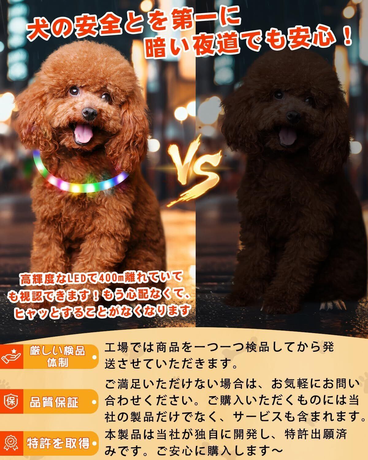 【光る首輪】LEDライトが明るく点灯。暗闇の中で愛犬をすばやく識別することができます。