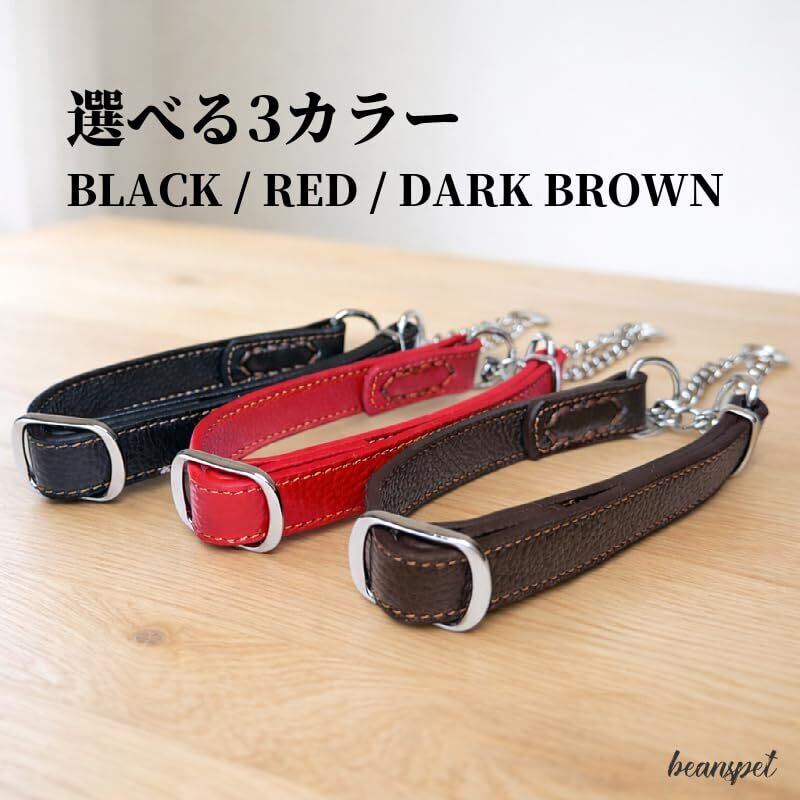 【サイズ】S:調節範囲約28~40cm 幅1.5cm M:調節範囲約35~48cm 幅2cm L:調節範囲約40~53cm 幅2.5cm 愛犬の頭囲はハーフチョークの調節範囲内であれば、着用可能です。シックなブラック、深みのあるブラウン、華やかなレッドの3色展開。S/M/Lのサイズ展開で小型犬から大型犬までぴったり対応します。