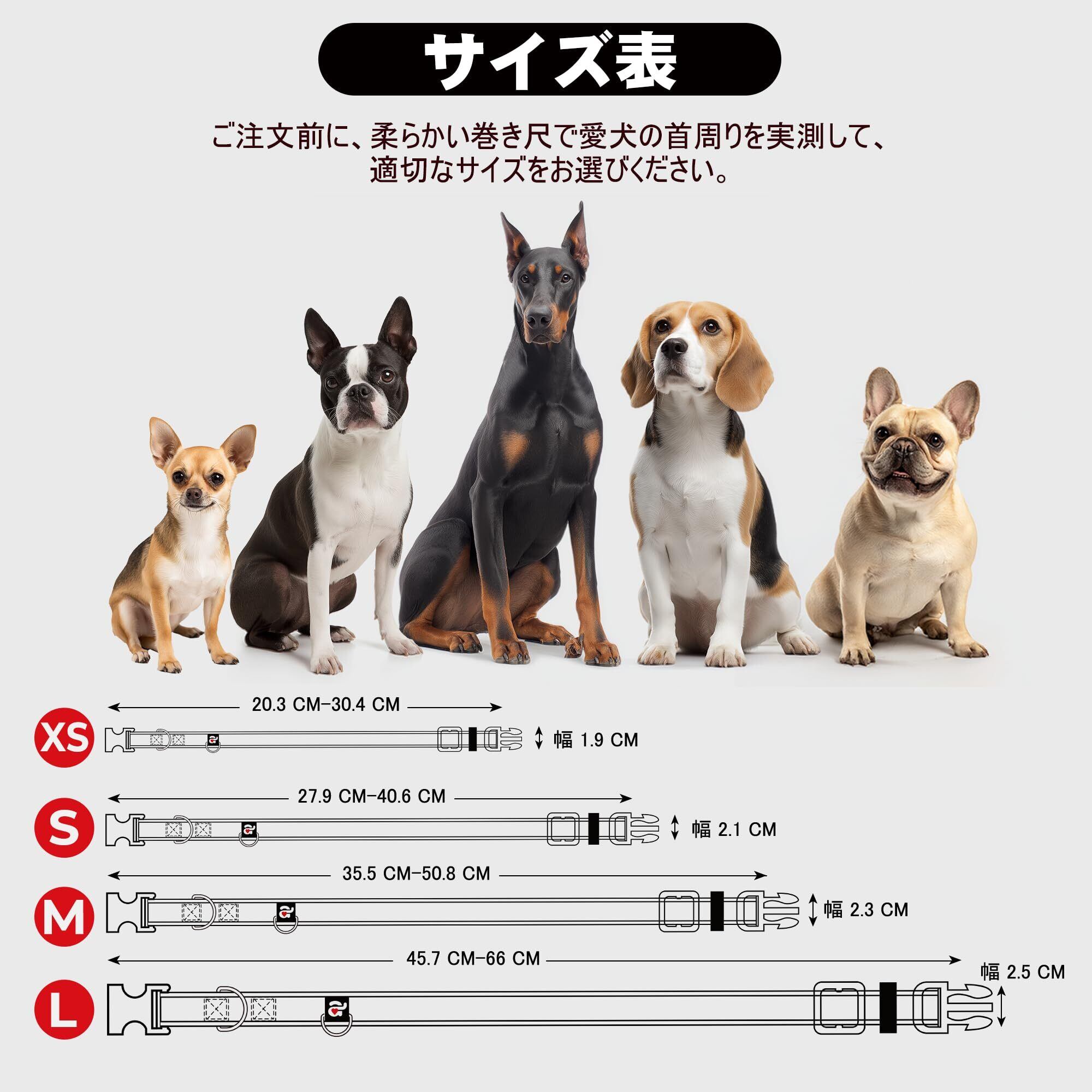 サイズ:XS:幅1.5cm、ネックサイズ20-30 cm,XS:幅2.0cm、ネックサイズ30 ~ 40cm,M:幅2.5cm、ネックサイズ40 ~ 50cm,L:幅2.5cm、ネックサイズ50~60cm。