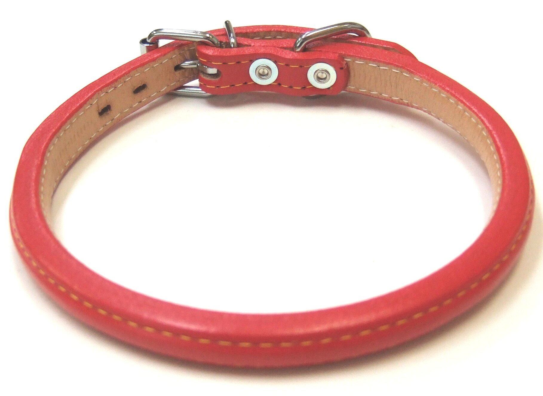 本革を二枚縫い合わせた丸型の毛切れが少ない首輪。天然牛皮製なので静電気が起こりにくい!