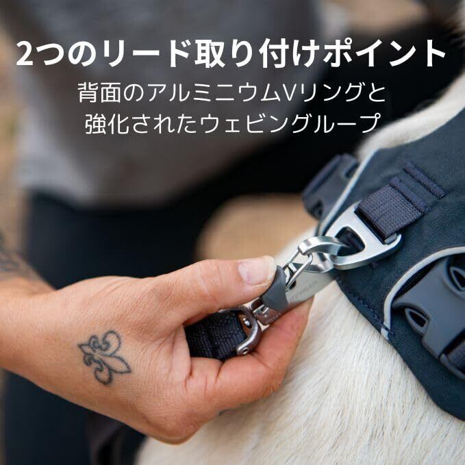 【機能/特徴】頭を通してバックルを留めるだけで簡単に装着ができ、首回りと胴回りの左右計4か所のアジャスターを調整することで体にぴったりとフィットします。また、クッション性の高いパッド入りなので長時間でも快適に着用することができます。リーシュは背面と胸元の2か所に取り付けが可能で(背面は軽量で強いアルミニウム製Vリング、胸元のループは強度と弾力性に優れた強化ウェビング)、胸元にリーシュを取り付けるとリーシュを引っ張る犬の方向転換がしやすくなります。