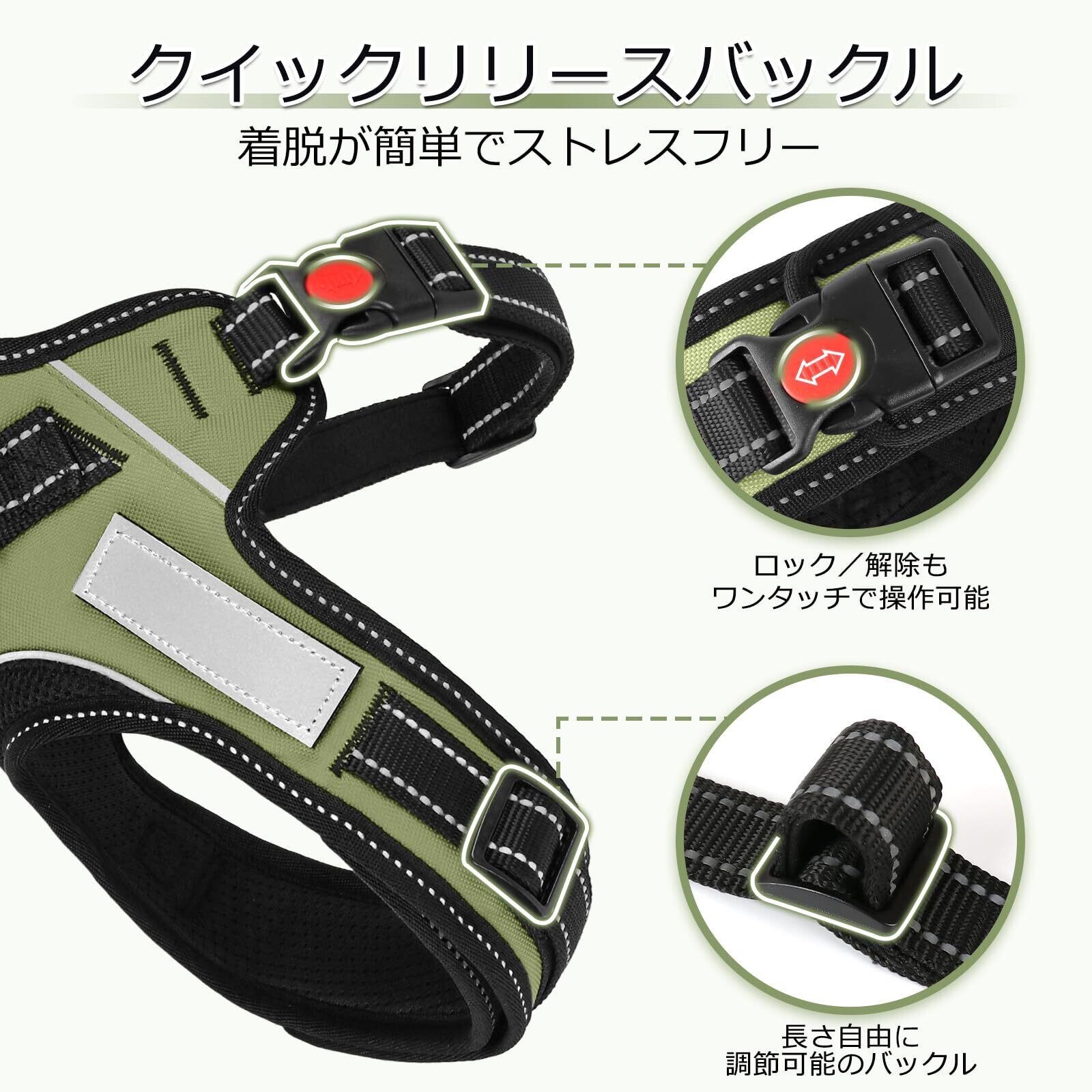 犬ハーネス 犬用胴輪 小型犬 中型犬 大型犬 ハーネス 喉に優しい 引っ張り防止 サイズ調整可能 メッシュ 通気性 簡単着脱 補助ハンドル付き 反射素材 夜間安全 散歩 しつけ用 可愛い おしゃれ (ダークグリーン, L)
