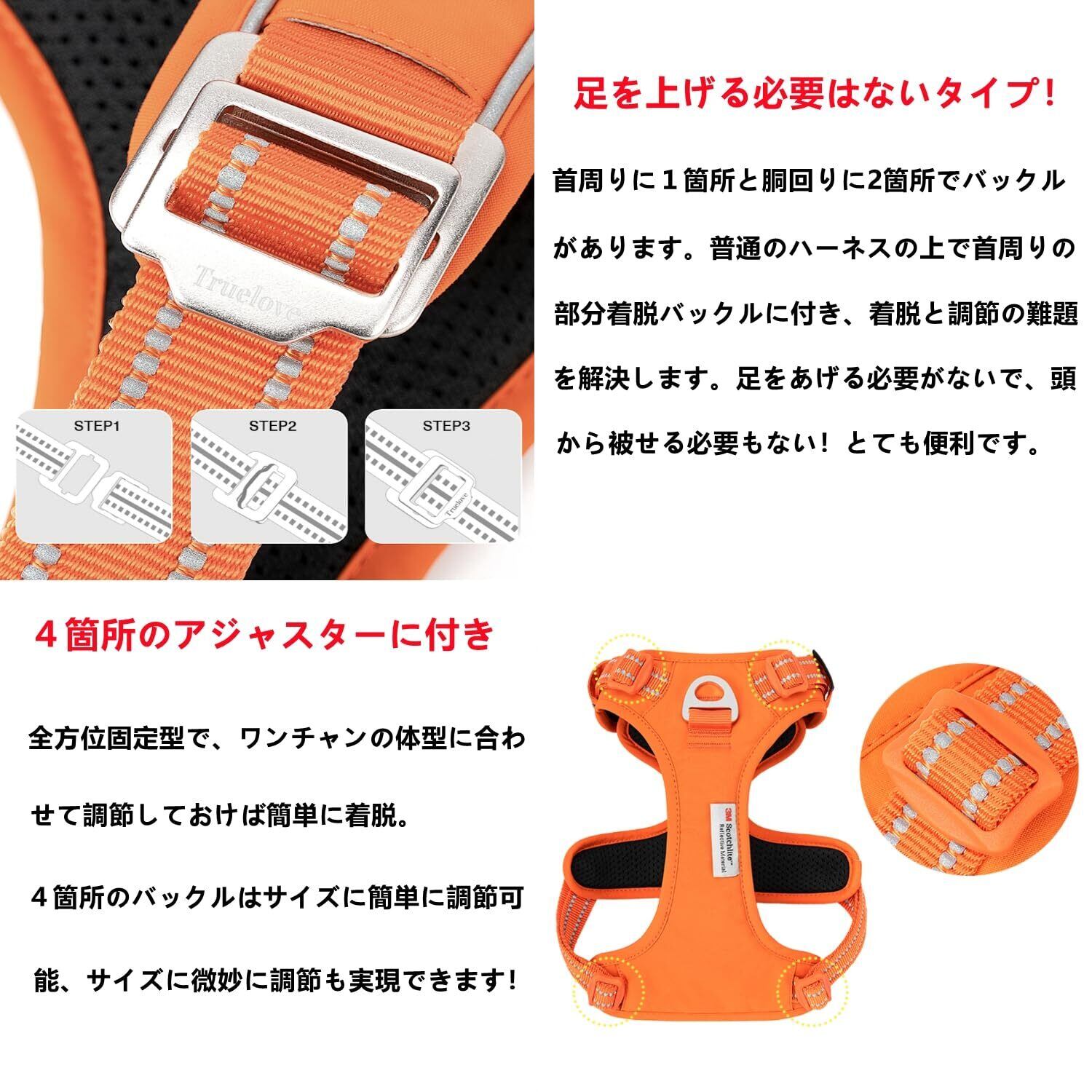 【新しいデザイン2点】:12023最新素材Dopont Corduraナイロン生地登場:耐候性、耐溶性、良い耐熱性を持って、柔軟性、耐久性、軽くて弾力性も優れた素材です。表面が滑らかで高級感が以前より上がっています。それに、商品重量以前により下がっていて、ご愛犬に優しいです。2、以前のより完璧なデザインで、とても使用しやすく、首回りに1箇所と胴回りに2箇所でバックルがあります。元のハーネスの上で首回りの調節の難題を解決します。足をあげる必要がなくて、頭から被せる必要もない!