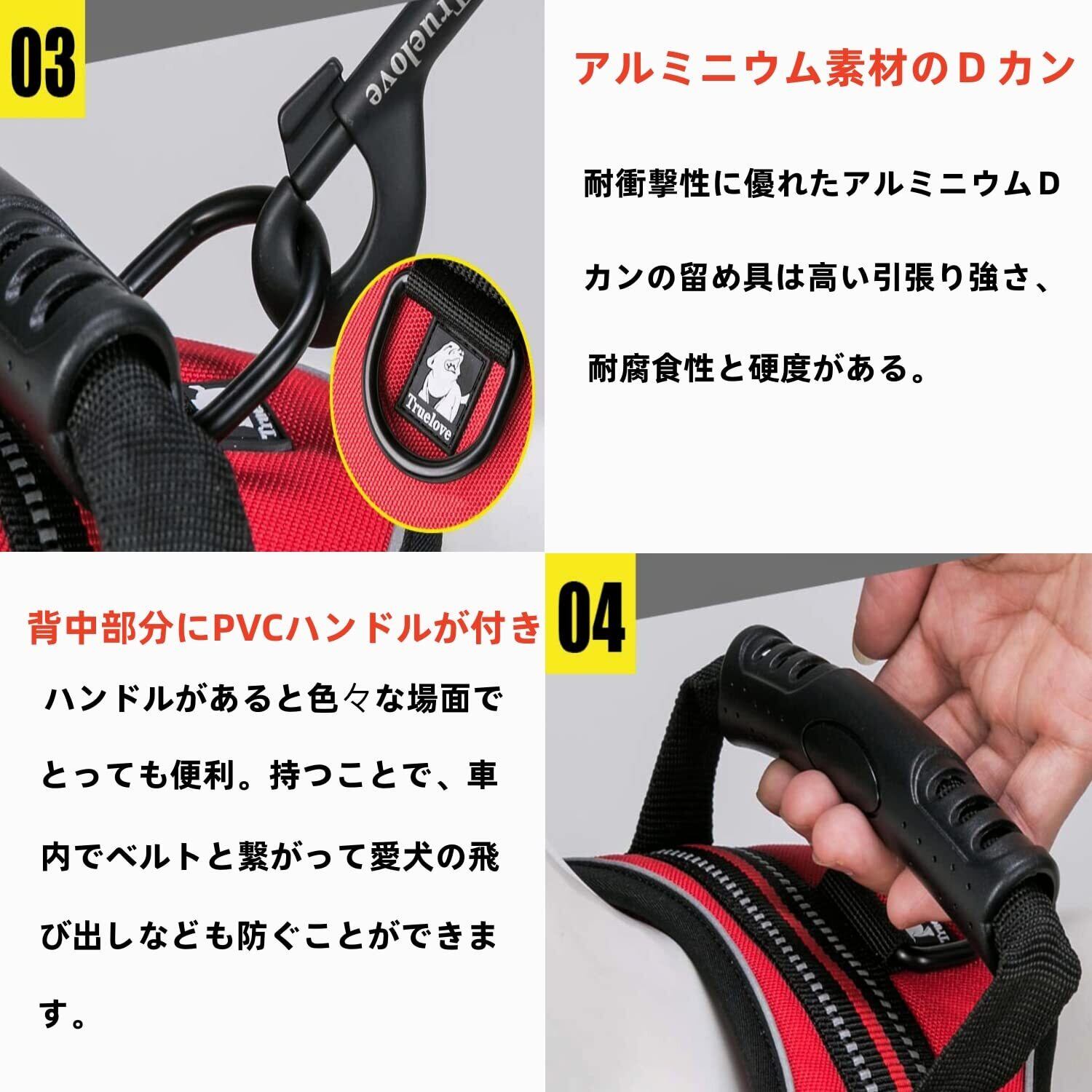 アルミニウム素材のDカン、背中部分にPVCハンドルが付き、車載功能:耐衝撃性に優れたアルミニウムDカンの留め具は高い引張り強さ、耐腐食性と硬度がある。それに、背中部分にPVCハンドルがついたハーネスです。ハンドルがあると色々な場面で とっても便利。持つことで、車内でベルトと繋がって愛犬の飛び出しなども防ぐことができます。