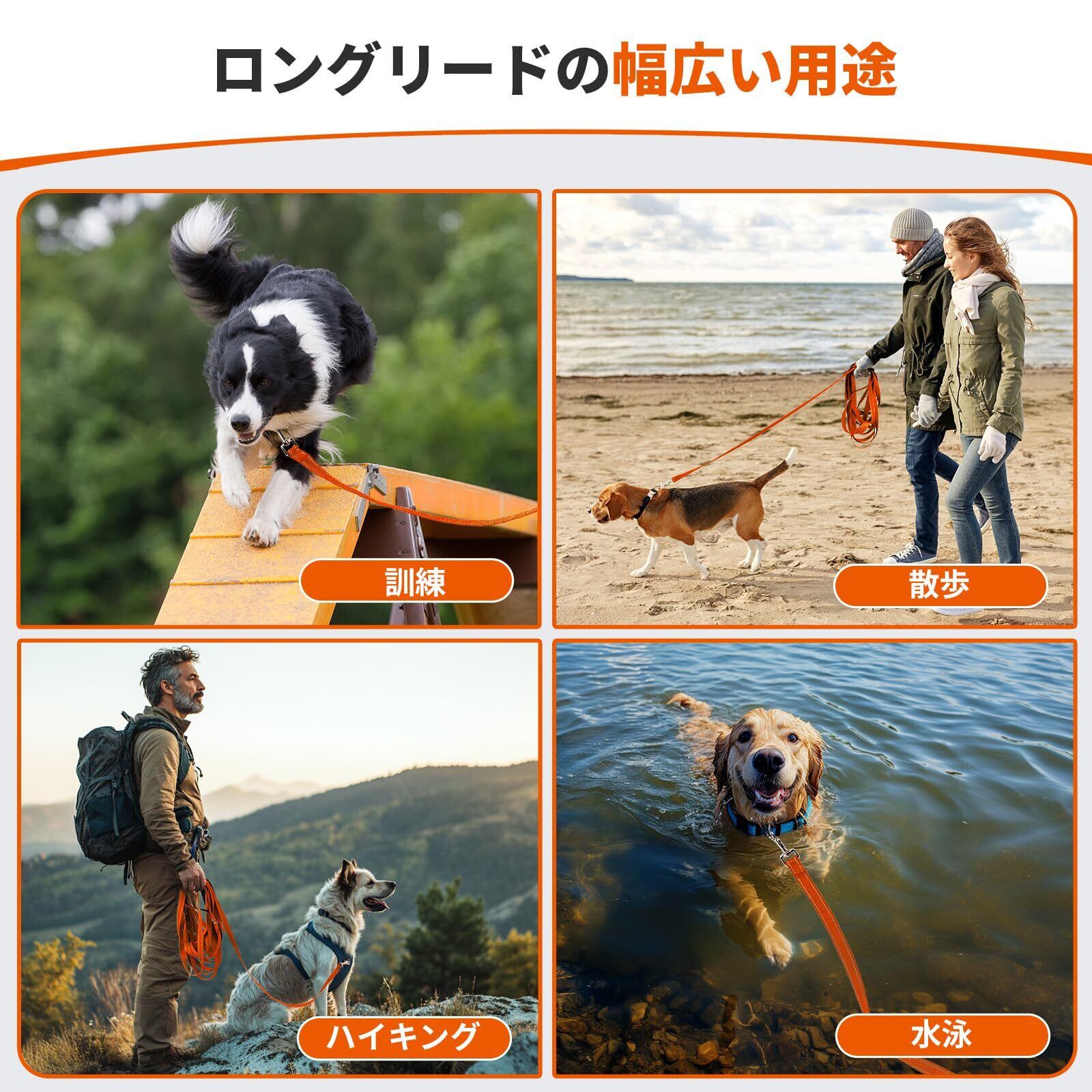 【在庫処分】犬用リード ロングリード 犬しつけ用 訓練 大型犬 中型犬 小型犬 反射糸 夜間安全 ナイロン製 丈夫 長い 犬 ペット用品 (オレンジ, 15m)