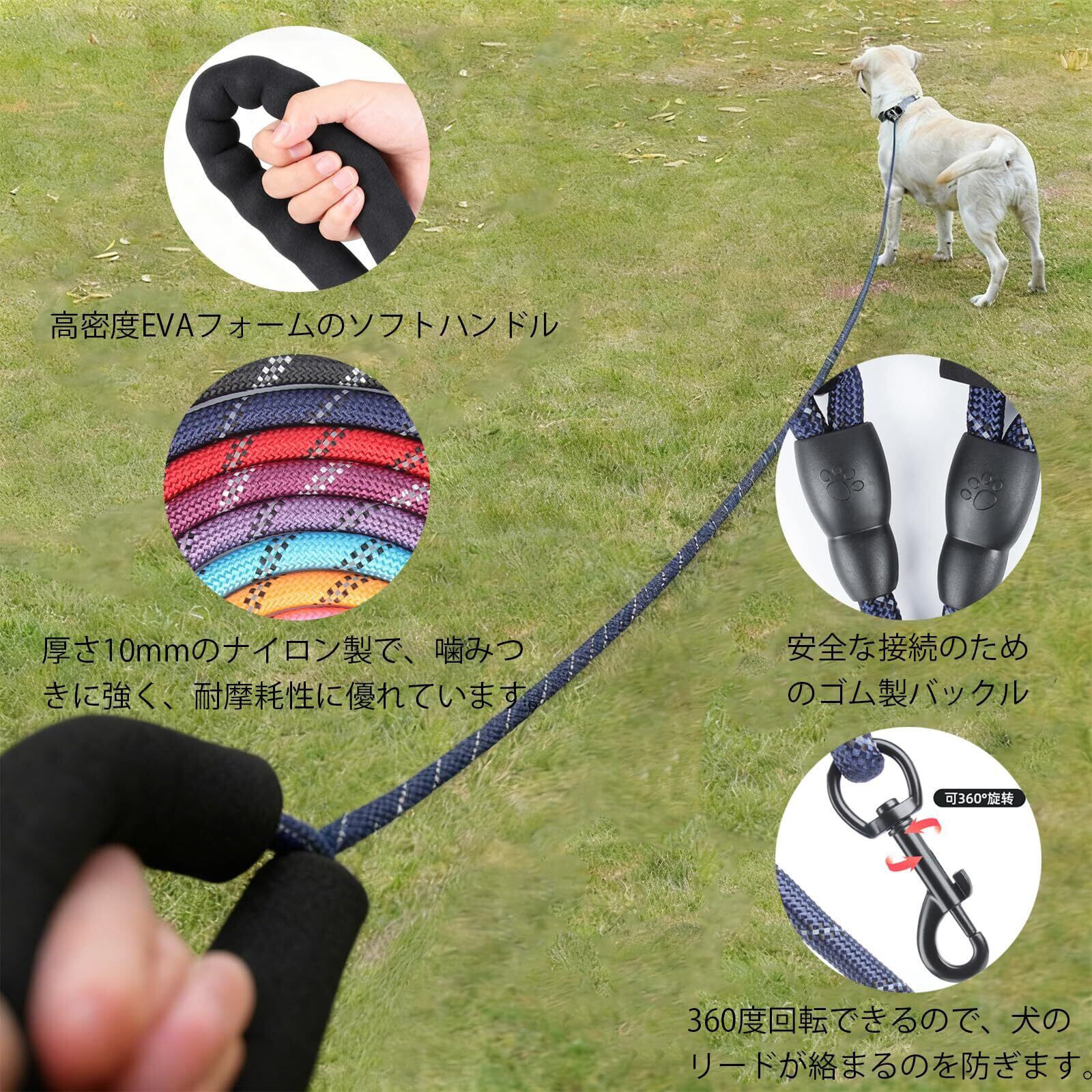【他社より耐久性が高い】この犬用リードはも強い登山用ロープで作られており、絡まりにくい丸いロープと耐久性のある360°金属フックが付いています。反射材も入っているので光を反射し、夜間の散歩にも最適です。