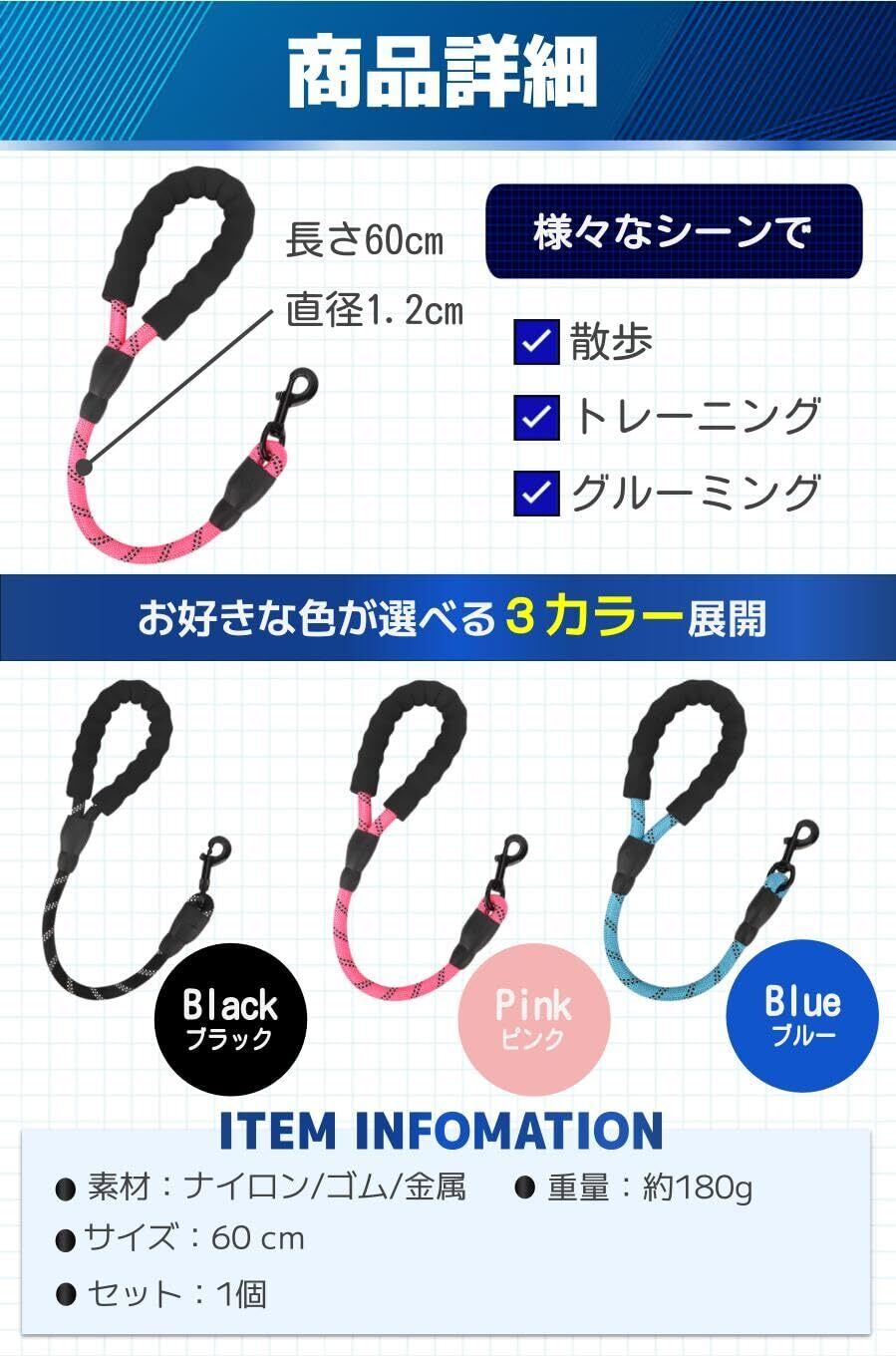 【商品特徴】①頑丈なリードフック:首輪とリードをしっかりと繋いでくれる/②掴みやすいグリップ:腕の負担を軽減してくれる/③直径1.2cmのリード:しっかりと太さがあるので切れる心配なし/④選べる3種のカラー:3色展開で好みの色を選べる