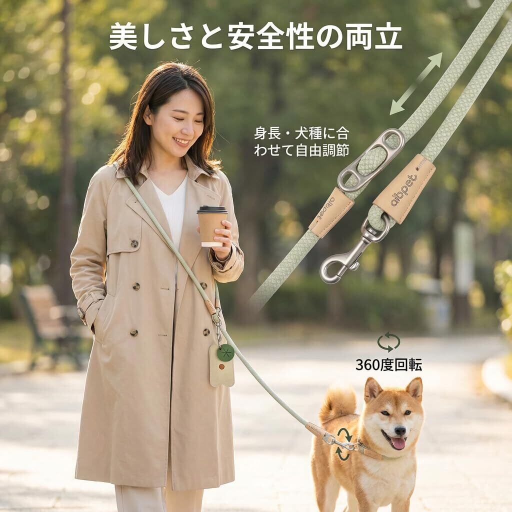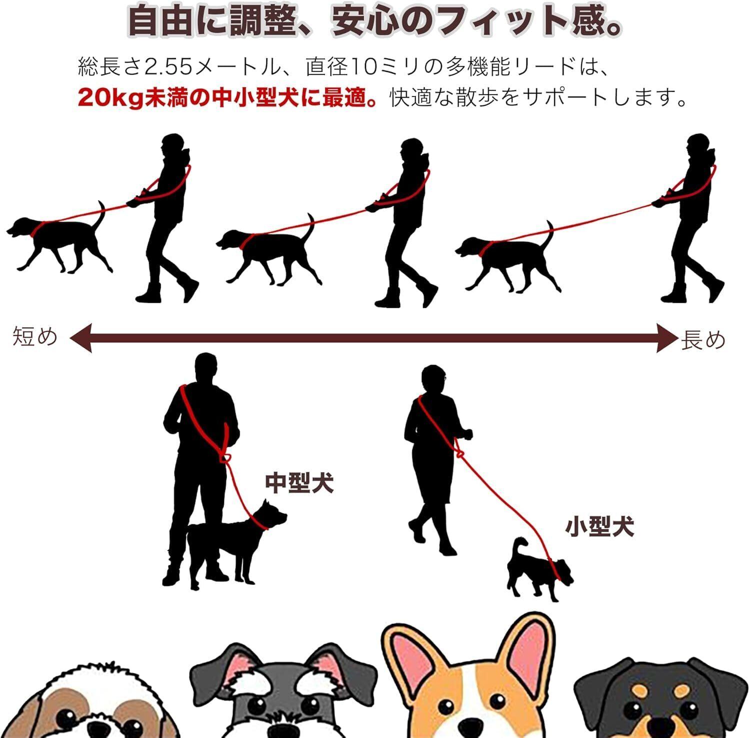 【快適なフィット感】愛犬にも飼い主にも優しい調整機能 リード本体と肩ストラップの両方の長さを自由に調整可能。犬のサイズや歩く速度、飼い主の身長にぴったり合わせられ、お互いが快適な散歩を実現します。360度回転するフックで絡まりにくく、操作もスムーズです。