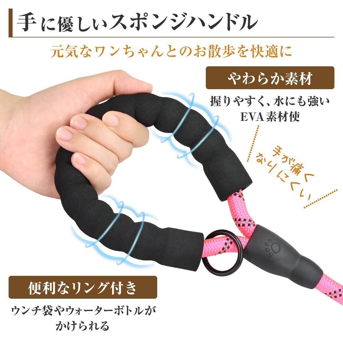 【手が痛くならないハンドル】飼い主さんが握るスポンジハンドル部分には、高軽量・耐水性・弾力性が特徴のEVA素材を使用しています。程よいクッション性と凹凸が手にフィットして握りやすく、長時間の散歩もラクに過ごすことができます。ハンドルにはウンチ袋やペットボトルなどを引っ掛けるのに便利なOカンも完備しています。