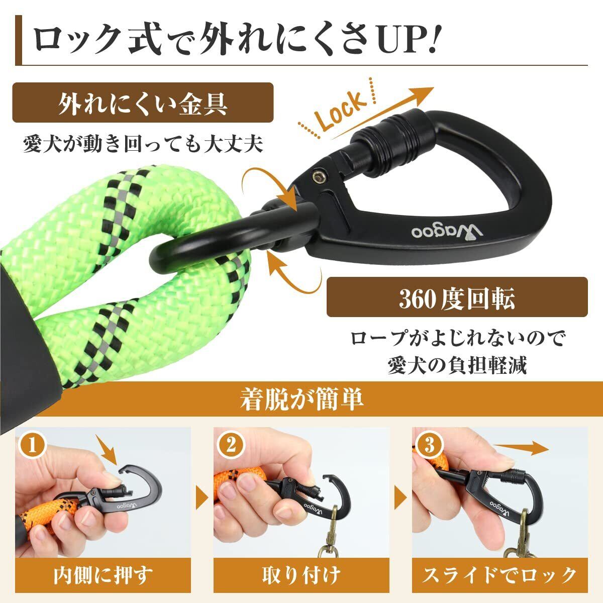 【ロック式で外れにくい】一般的な犬用リードの取り付け金具は鉄砲ナスカンを使用していますが、本製品ではロック式カラビナを採用していることで勝手に外れない設計になっています。カラビナの根元部分は360度回転により、ワンちゃんが動き回ってもロープがよじれるのを防止し、負担軽減にも役立ちます。外れにくいだけでなく、簡単に着脱できるため散歩前にワンちゃんを待たせることなく準備することができます。