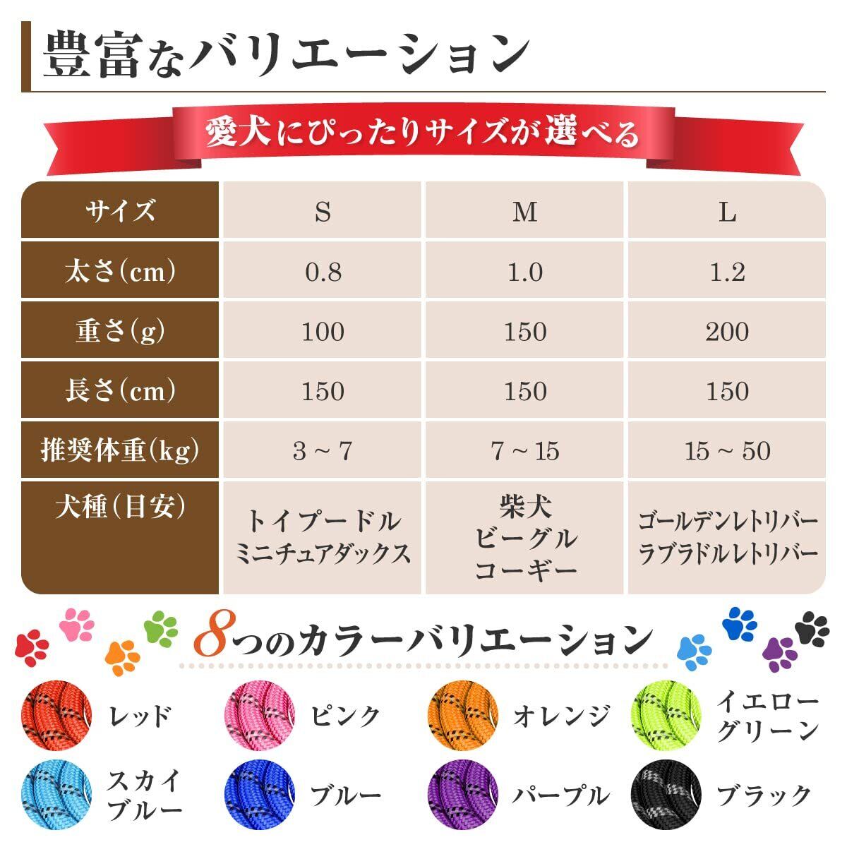 【ワンちゃんとの散歩をより快適に】金具の外れにくさ・手に優しい持ち手など飼い主さんのことを想って作られた犬用リードです。サイズは小型犬から大型犬までお使いいただけるS・M・Lをご用意!カラーは8色と豊富に取り揃えており、どれも鮮やかな発色で視認性が高いデザインが魅力です。愛犬にピッタリなサイズ×カラーが見つかるはず!