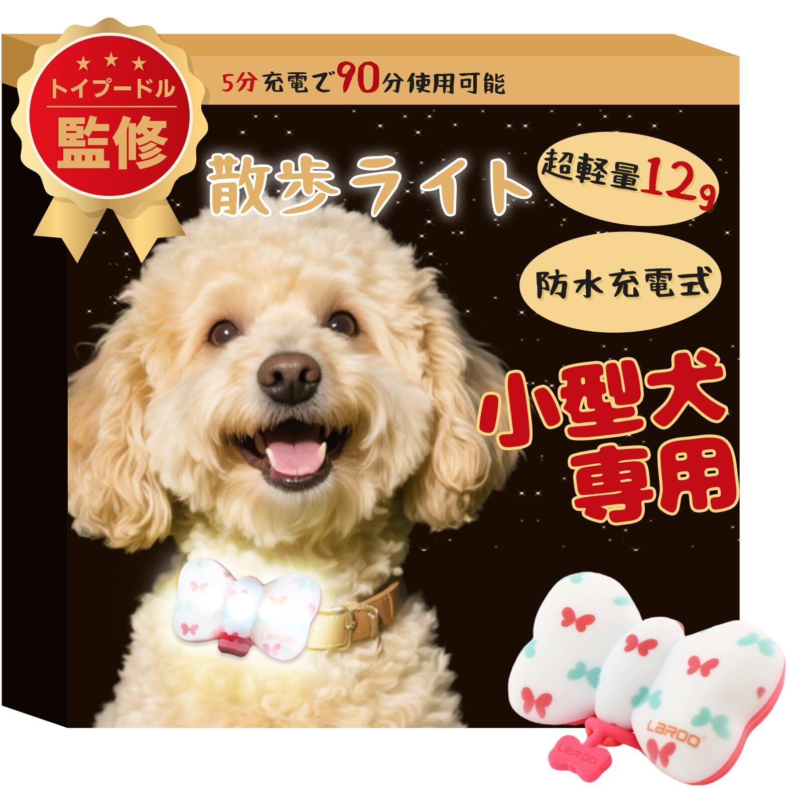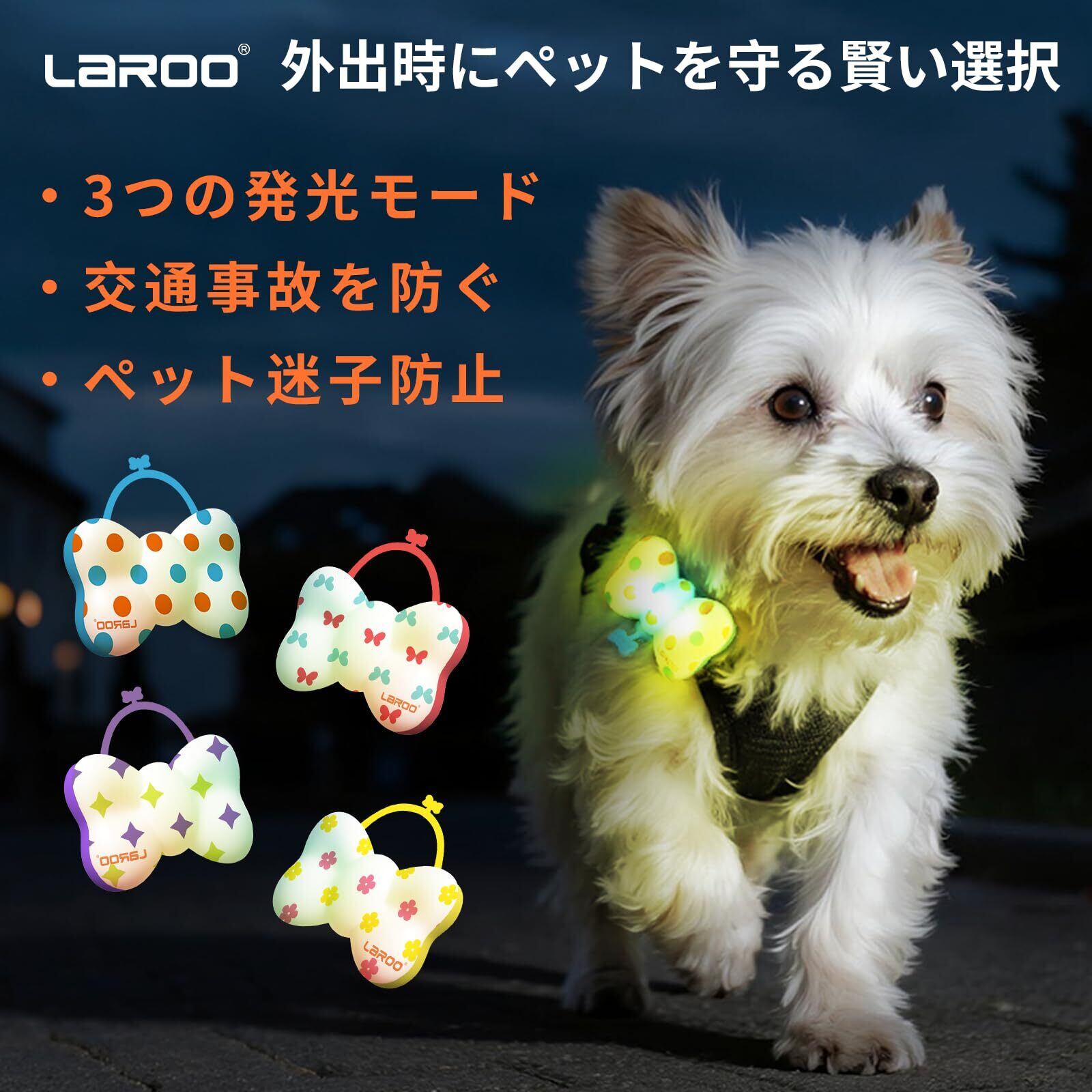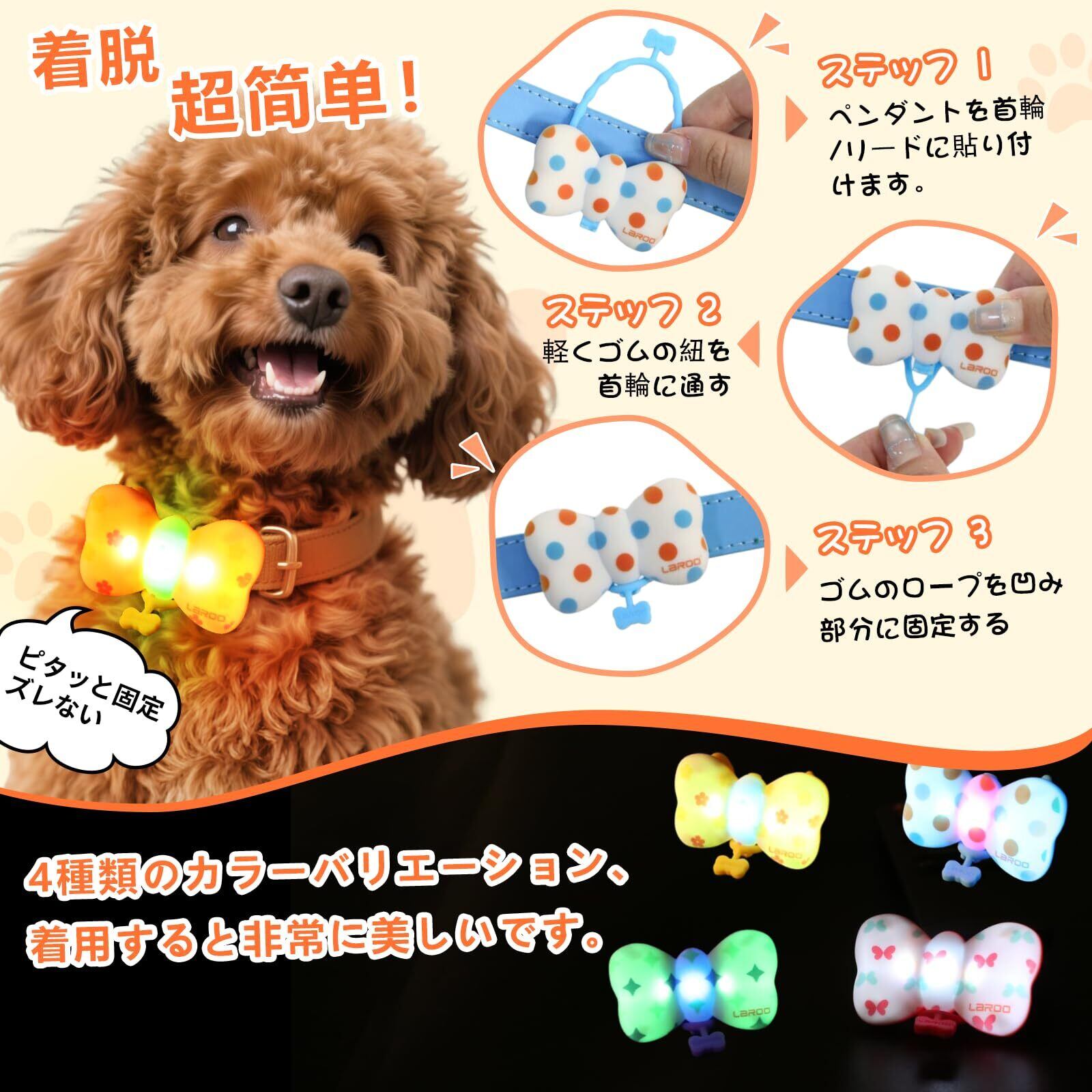 【デザイン性 】ドット柄の蝶ネクタイ型LEDライト(5.7cm x 3.4cm)で、スタイリッシュかつ機能的なペットアクセサリー。わずか12gの軽量設計で、小型犬から中型犬まで快適な装着感を実現,装着がしっかりしていて、揺れない。
